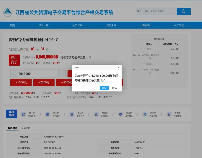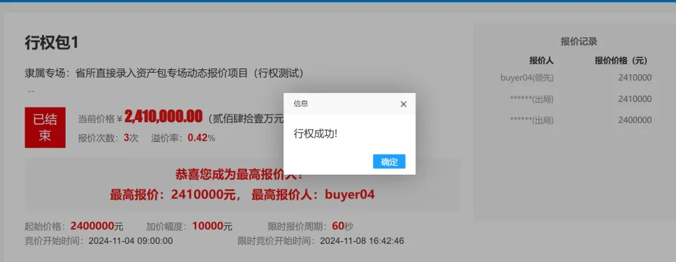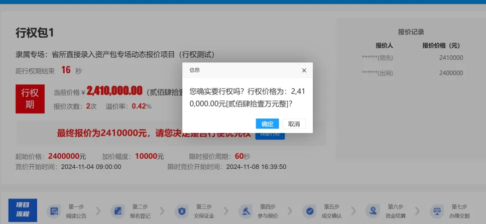 点击【确定】,则以最终报价金额报价,行权成功,点击【取消】则放弃此行权操作,在行权期间内都未行权,则优先权人放弃竞买该项目。