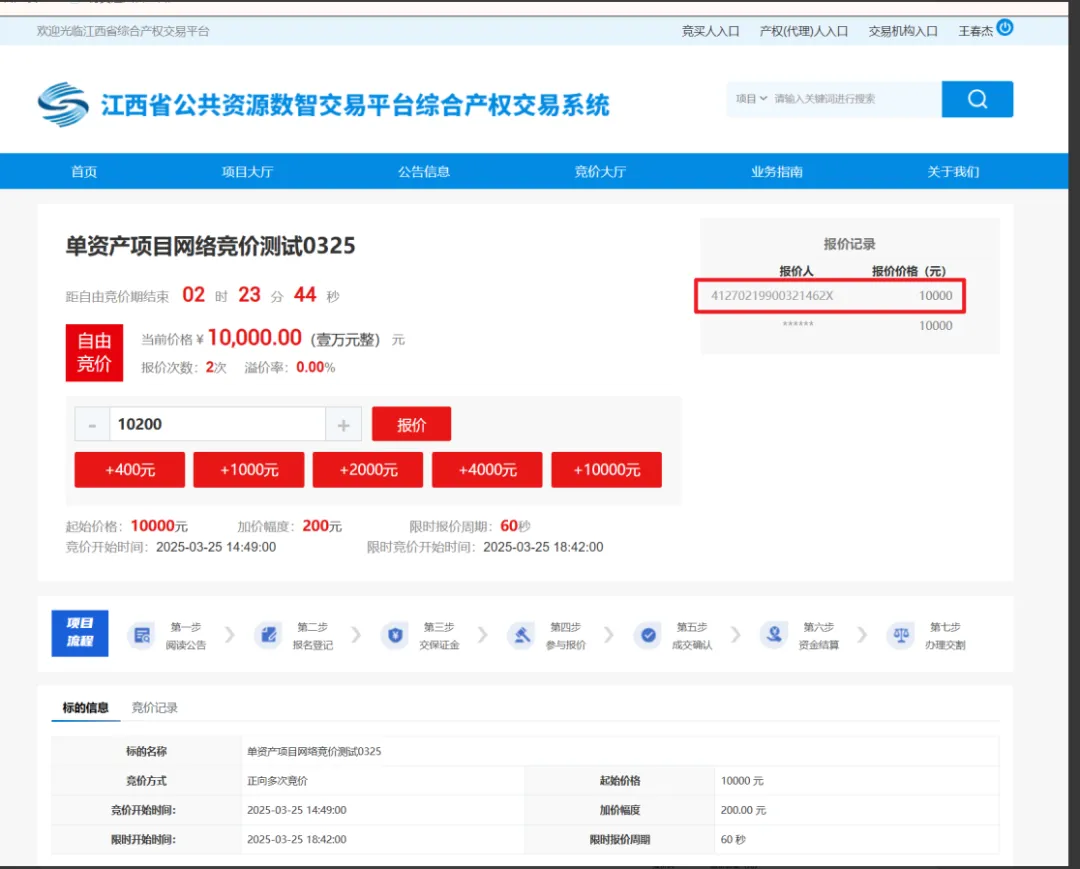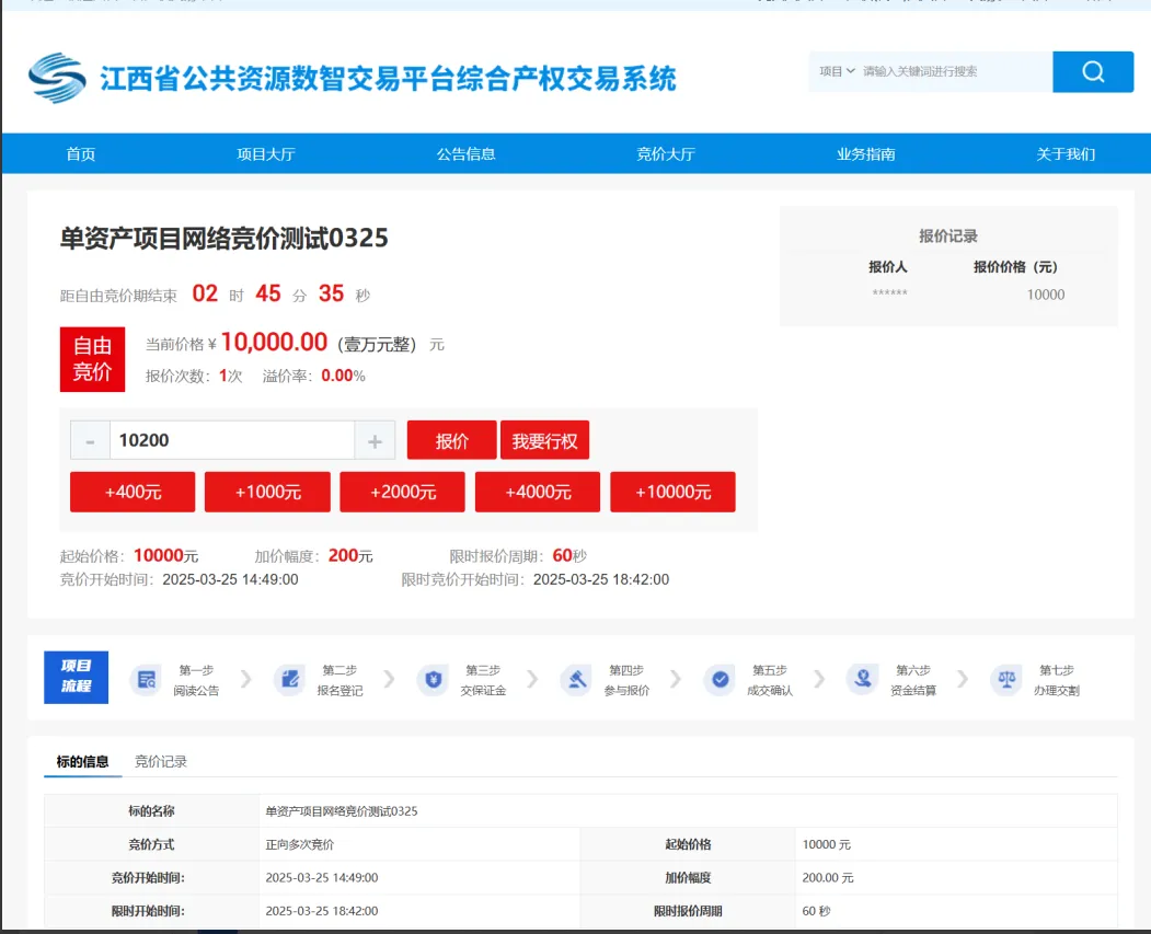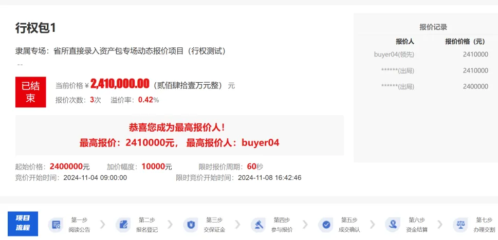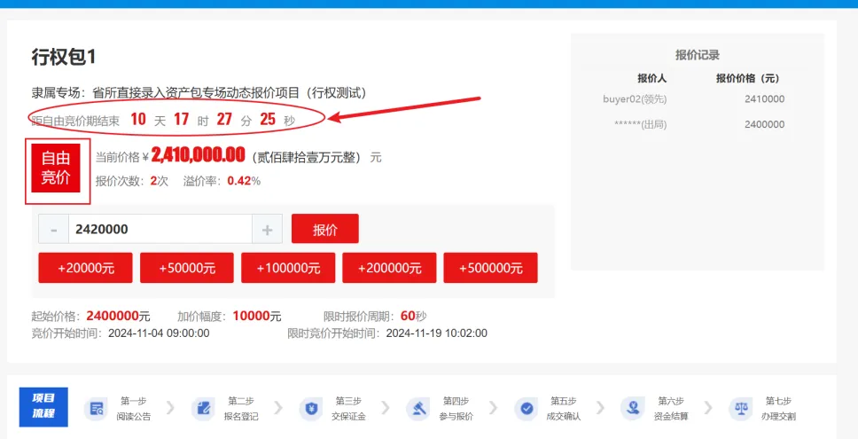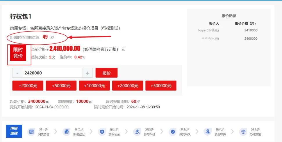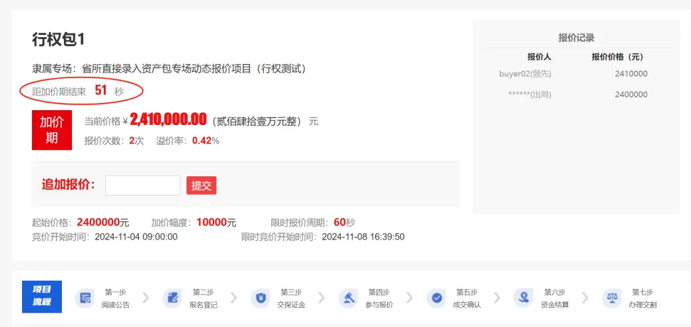 若竞价设置了事后行权,最高报价人行权,则限时竞价期结束后,进入加价期,状态为加价期,并显示距加价期结束的时间,最高报价用户可追加报价。