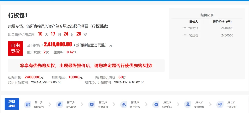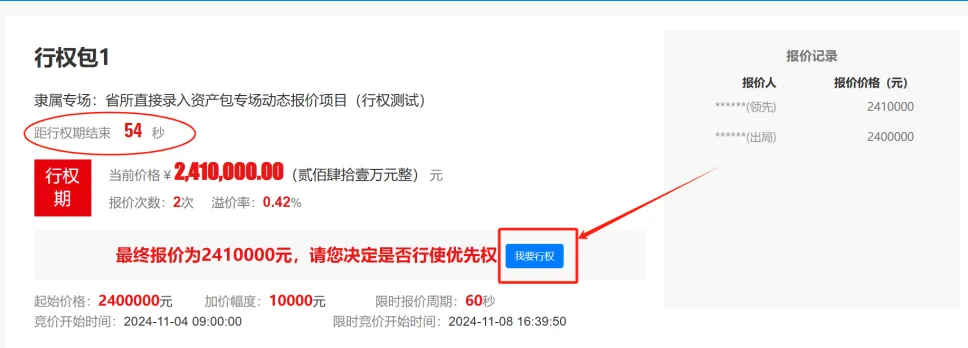 点击【我要行权】后,以其他报价人当前报的最高的价格报价行使优先购买权。