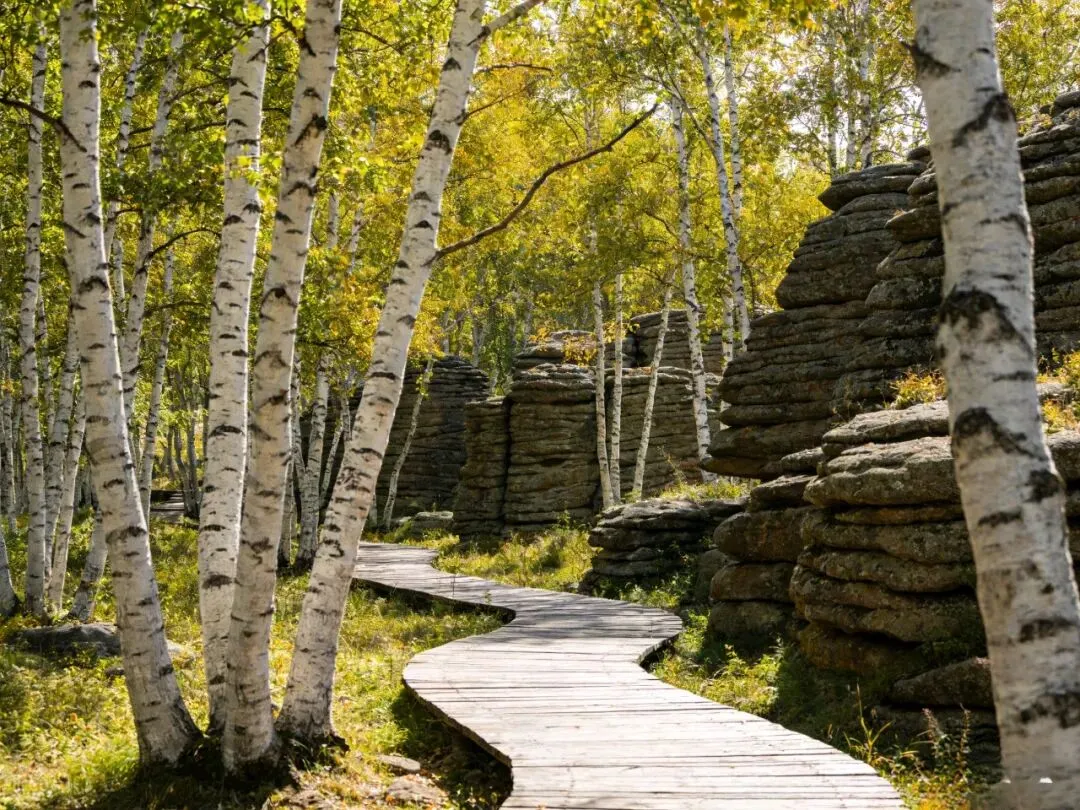好多人来景区,就知道拍纯石林,压根没发现这个机位,就在景区西区,观光车下来走5分钟就到,几乎没人,全是原生态的白桦林和零散石林,温柔又治愈。步道两旁全是笔直的白桦树,阳光透过枝叶洒下来,光影巨美,地上铺满白桦叶,踩上去沙沙响,旁边的石林错落有致,既有石林的魔幻,又有白桦林的温柔,反差感绝了。