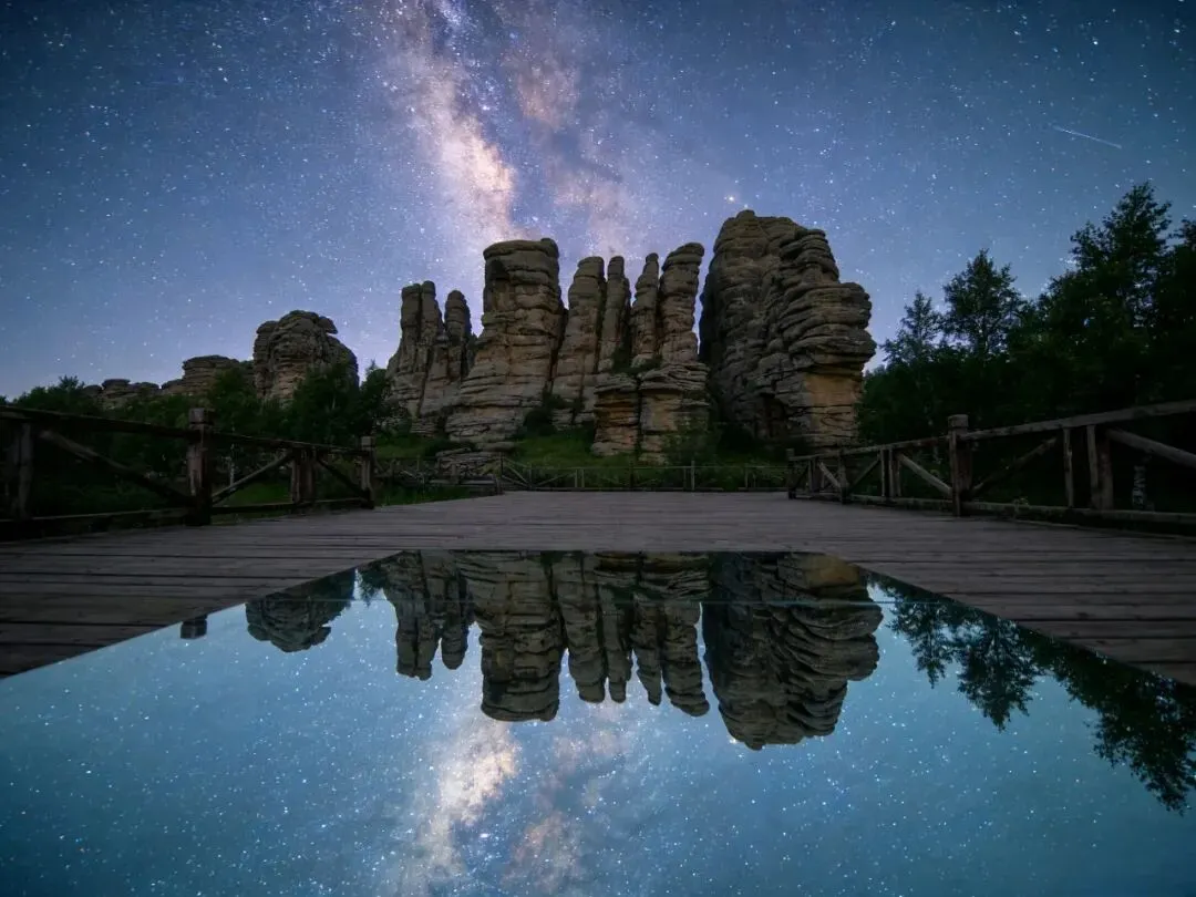 这就是标题里的核心彩蛋,也是最魔幻的机位,藏在景区北区,只有本地司机才知道,导航搜不到,跟着司机走才能到,晚上拍星空绝了,居然能拍出国外星空的镜像感!这儿海拔高,光污染特别少,天气晴朗的夜晚,抬头就是漫天繁星,银河都看得清清楚楚,搭配下方形态奇特的石林,拍出来的照片,星空倒映在石林的岩石上,形成镜像效果,跟冰岛、挪威的星空一模一样,别人压根看不出你是在赤峰拍的。