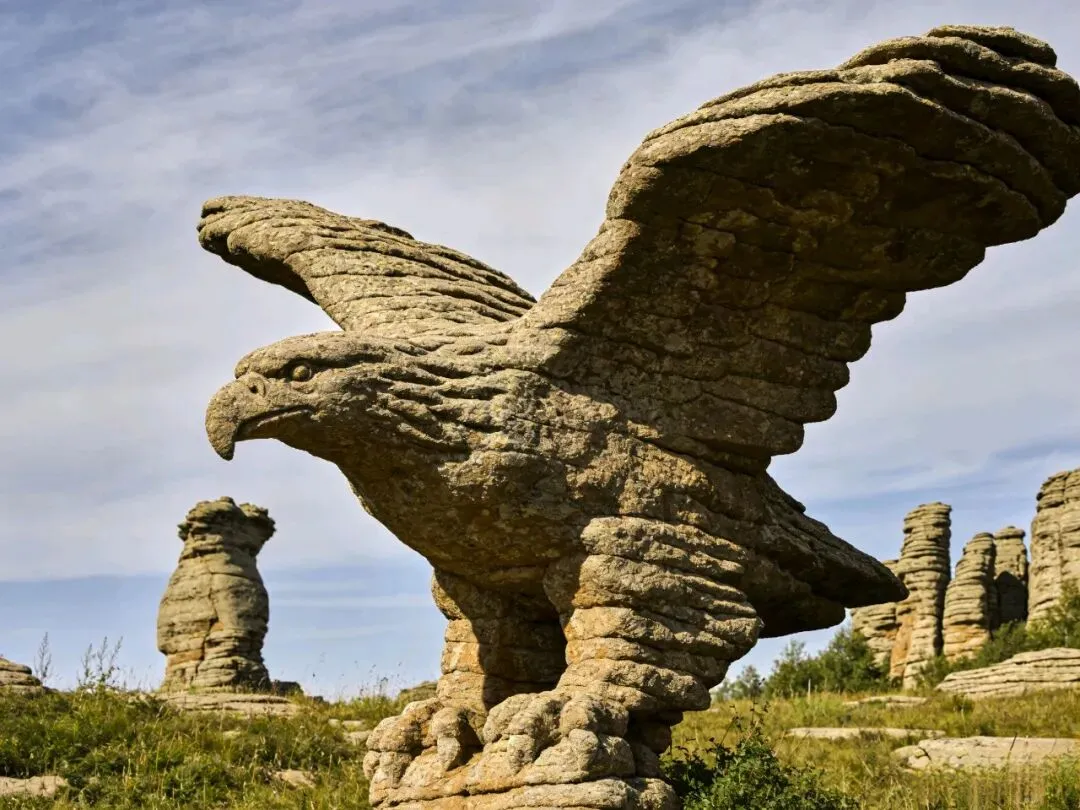 这个机位适合喜欢拍细节、想涨知识的宝子,就在景区东区,擎天柱观景台旁边,人很少,重点拍“鲲鹏石”的细节。这块石头长得特别像展翅要飞的鲲鹏,栩栩如生,岩石表面还有清晰的冰川侵蚀痕迹,一层一层的,跟“千层饼”似的,这就是克什克腾石阵独有的样子,拍出来既有质感,又能涨知识。