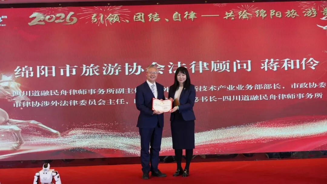 为表彰先进、凝聚共识,年会现场举行了会员单位授牌仪式,对积极支持协会工作、为行业发展作出突出贡献的会员单位予以表彰。同时,为强化行业法治保障,协会正式聘用四川道融民舟律师事务所蒋和伶律师为法律顾问,并现场颁发聘书。作为绵阳本地老牌规模化强所,四川道融民舟律师事务所将为协会及会员单位提供专业的法律支持,助力文旅市场规范有序发展。