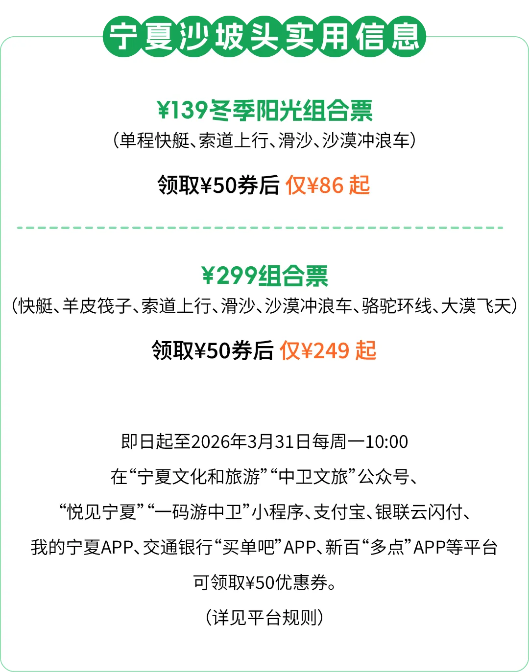 无论是从黄河水车门入园,还是从沙漠时空门入园,你都能在一趟旅行中同时欣赏到黄河与沙漠的壮美。这里的天然滑沙场、黄河飞索、黄河水车、羊皮筏子,刺激又有趣,等着你来探索。