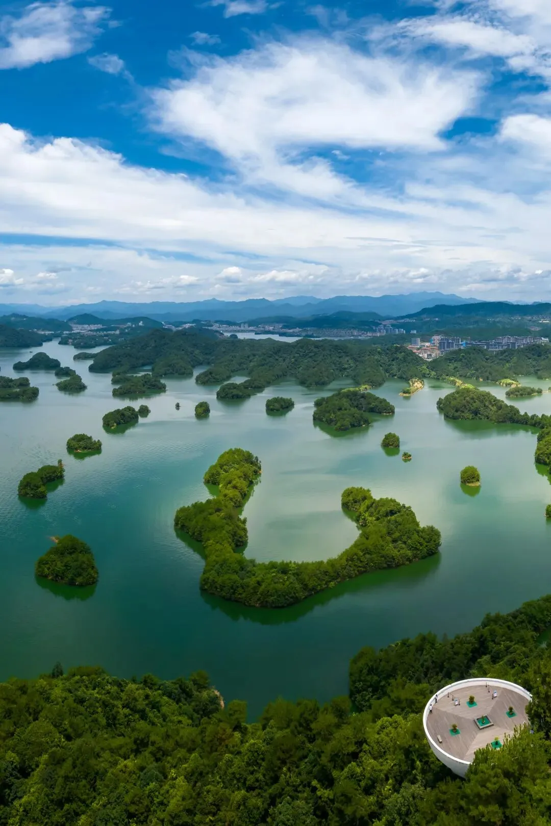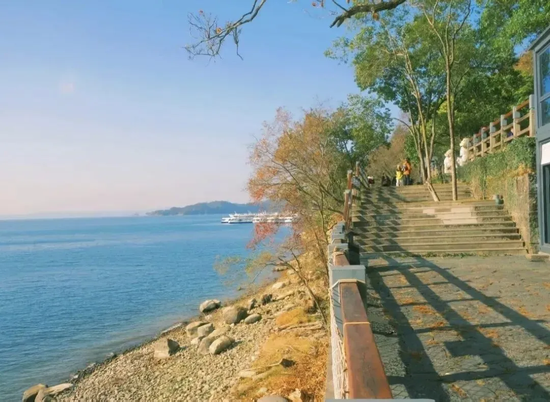沿湖栈道一侧是层叠的岛影,一侧是碧绿的湖光,晨昏的光最懂温柔,将万物浸染成静谧的色调,日常走路也能拍出海报效果。