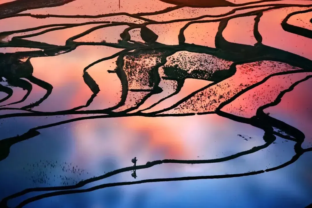 云南元阳的梯田盛着天光。丰水期的镜面倒映云霞,多依树的日出染亮层层水阶,爱春的梯田泛着清透的蓝。哈尼蘑菇房散落在田埂间,炊烟轻缠远山。