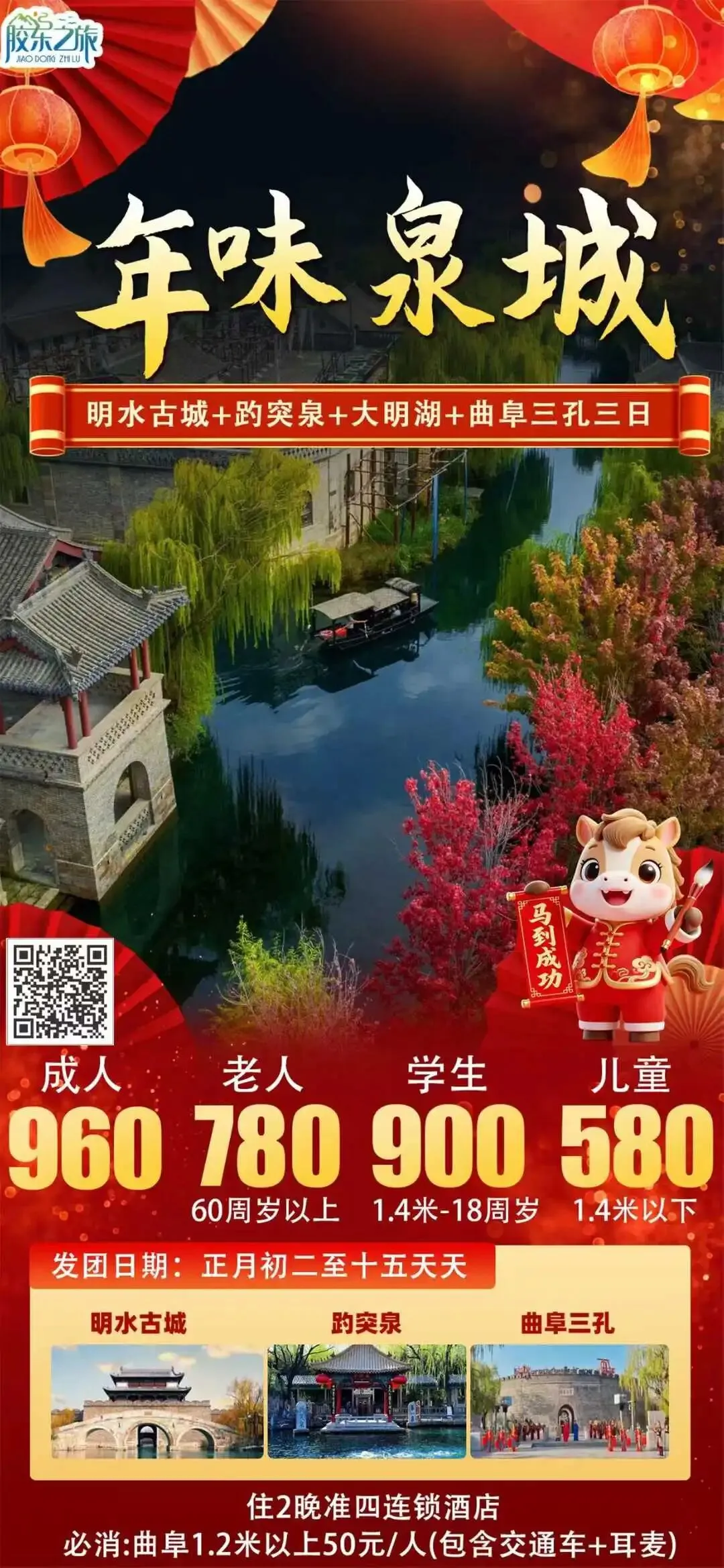1.明水古城+趵突泉+大明湖+芙蓉街+曲阜三孔三日游