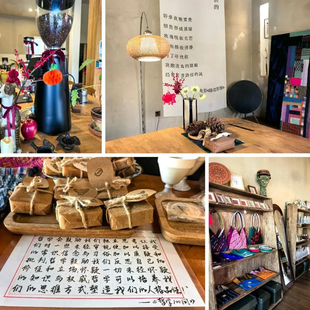 这家咖啡店的少数民族手工艺品挺好看,纸巾包,杯垫,包包,胸针……一阵一线都是景颇族的老人手工缝的,所以价格也不菲。