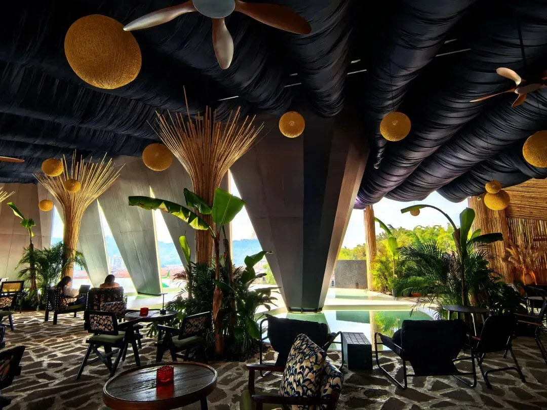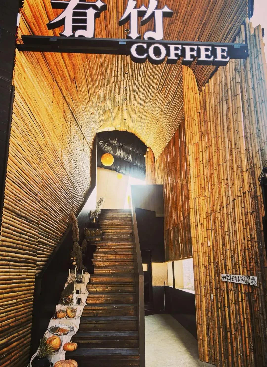 心心念念的“有竹咖啡”,午后的人并不多。进门就被惊艳到:整条通道用竹子包裹成拱形隧道,暖黄的灯光打在竹墙上,走进去仿佛穿越到了东南亚雨林秘境。