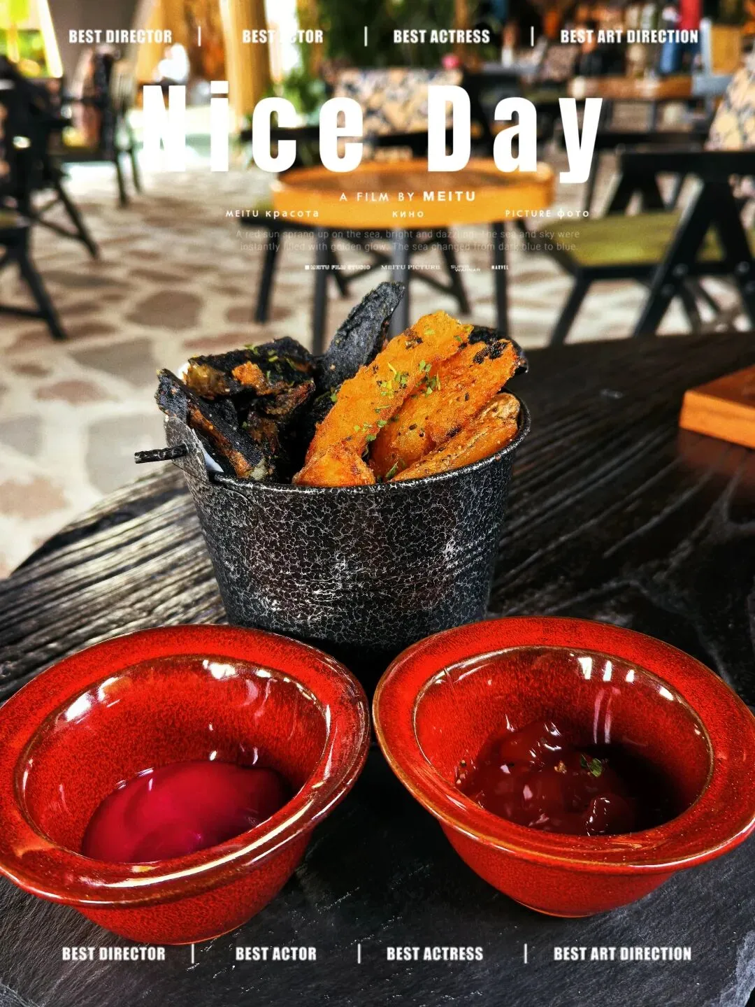 还点了“鸳鸯薯角”,黑、金两种颜色,蘸着两种不同的酱,好吃极了。