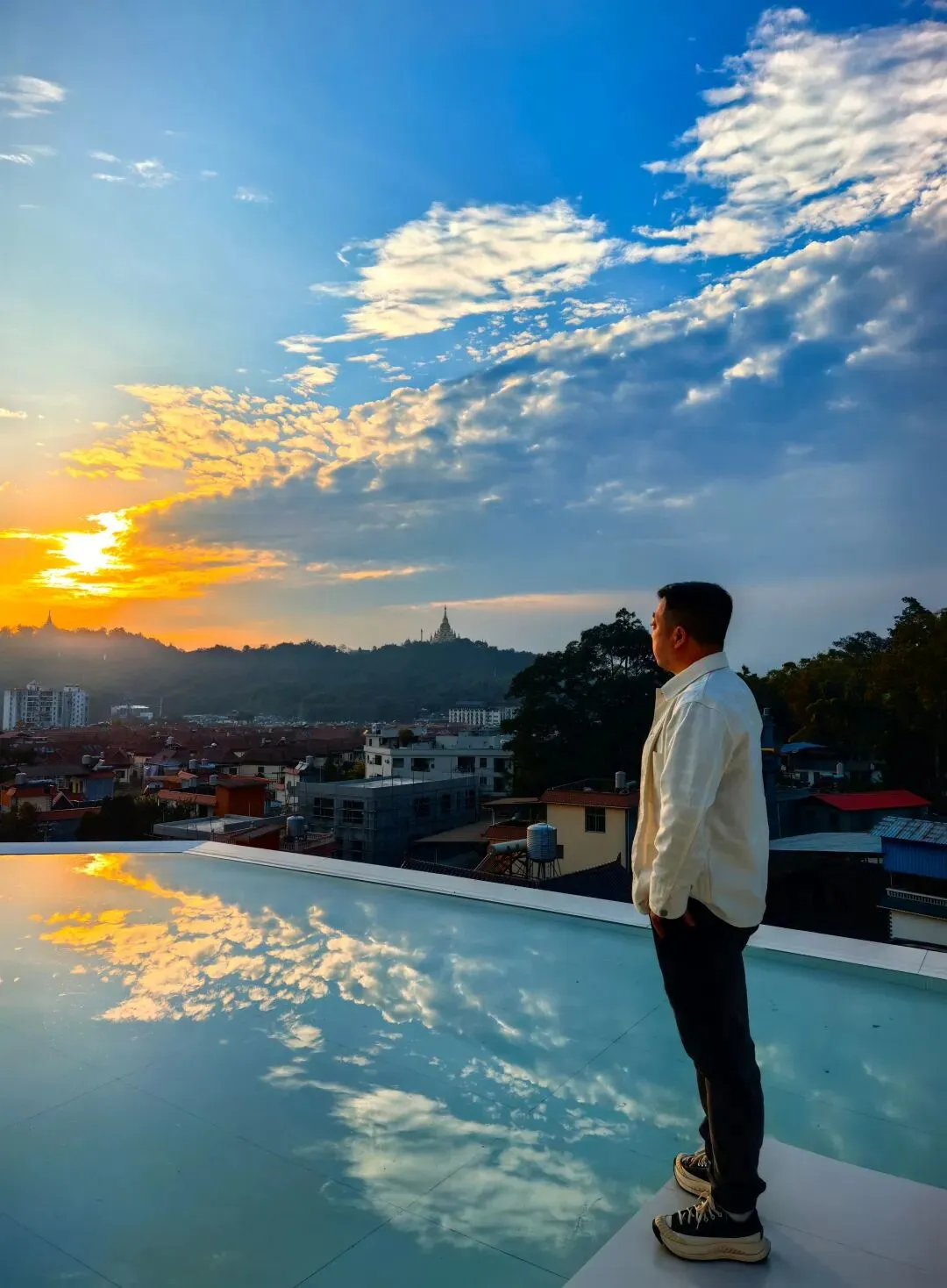 芒市全景,尽收眼底。远处山上的勐焕大金塔、大银塔巍然屹立于蓝天之下。