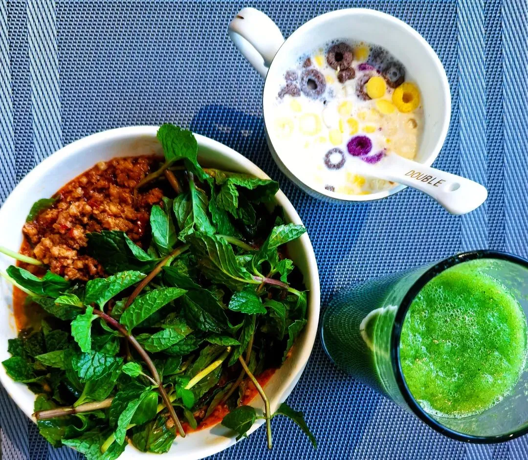 早上没出去吃原计划的撒撒(傣语中的凉拌米线),就在酒店吃。我最喜欢云南饵丝这一点——配料自己随便加。我舀了一大勺炸酱,挤了好多柠檬汁,再撒上一把新鲜的薄荷叶。咸香、酸爽、清凉,全都混在了一碗里,特别对我这个不吃辣的胃口。再喝点黄瓜汁,觉得整个人都清清爽爽的。