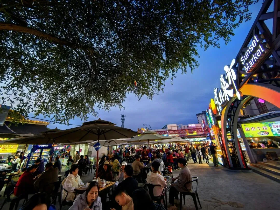 天黑了,去“新玩厂夜市”打卡。这是一个由老厂房改造而成的宝藏地,集美食、拍照和文创市集于一体,氛围感超棒!旧厂房里挂满了亮晶晶的灯,空气里全是各种食物混在一起的烟火气。