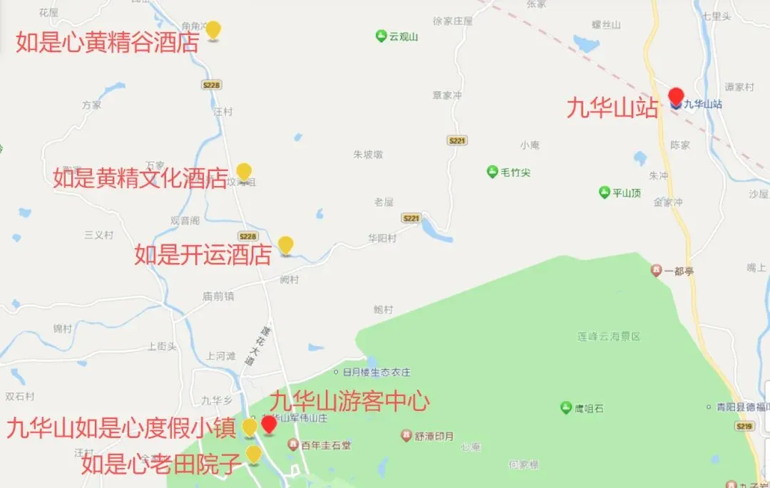 假如你是坐汽车来的,可直接到达九华山长途汽车站。游客服务中心与长途汽车站在一起,游客中心距离如是心度假小镇大约1公里,老田院子大约2公里,如是开运酒店和如是鸿运酒店大约3.5公里,开运酒店有免费的班车可以接送大家到大愿文化园和游客服务中心。如果您住在如是心黄精谷店,可以跟司机师傅说在五溪山色大酒店下车,然后步行或者打电话让工作人员去接您。
