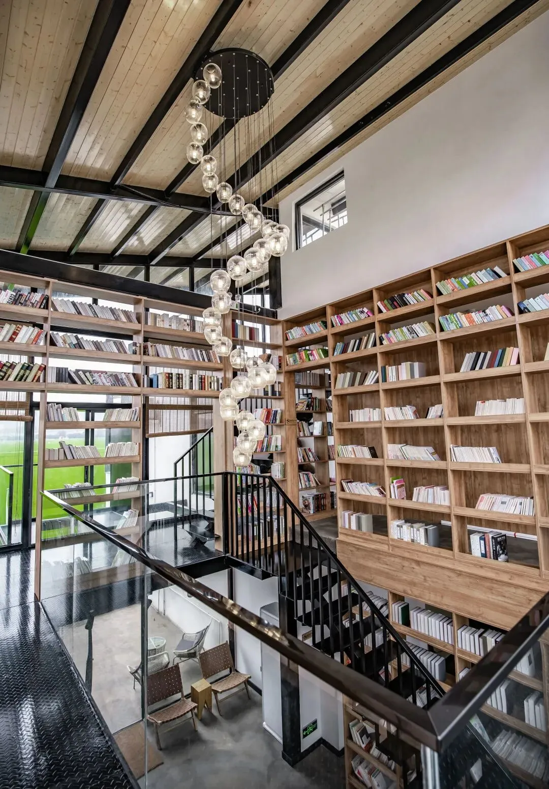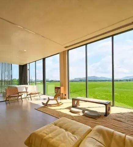 坐落于崖口的广袤稻田里,轻工业与日式简相结合。是民宿,也是藏在风景里的书屋。室内配有超大景观落地窗,还有旋转楼梯直达书墙,宁静闲适,自在悠然。