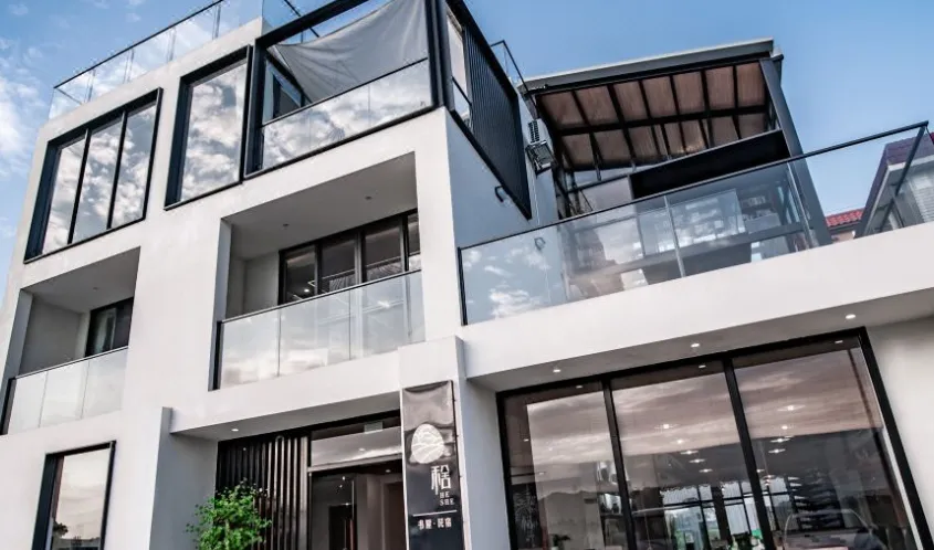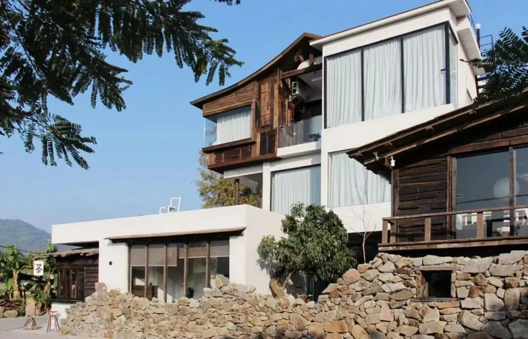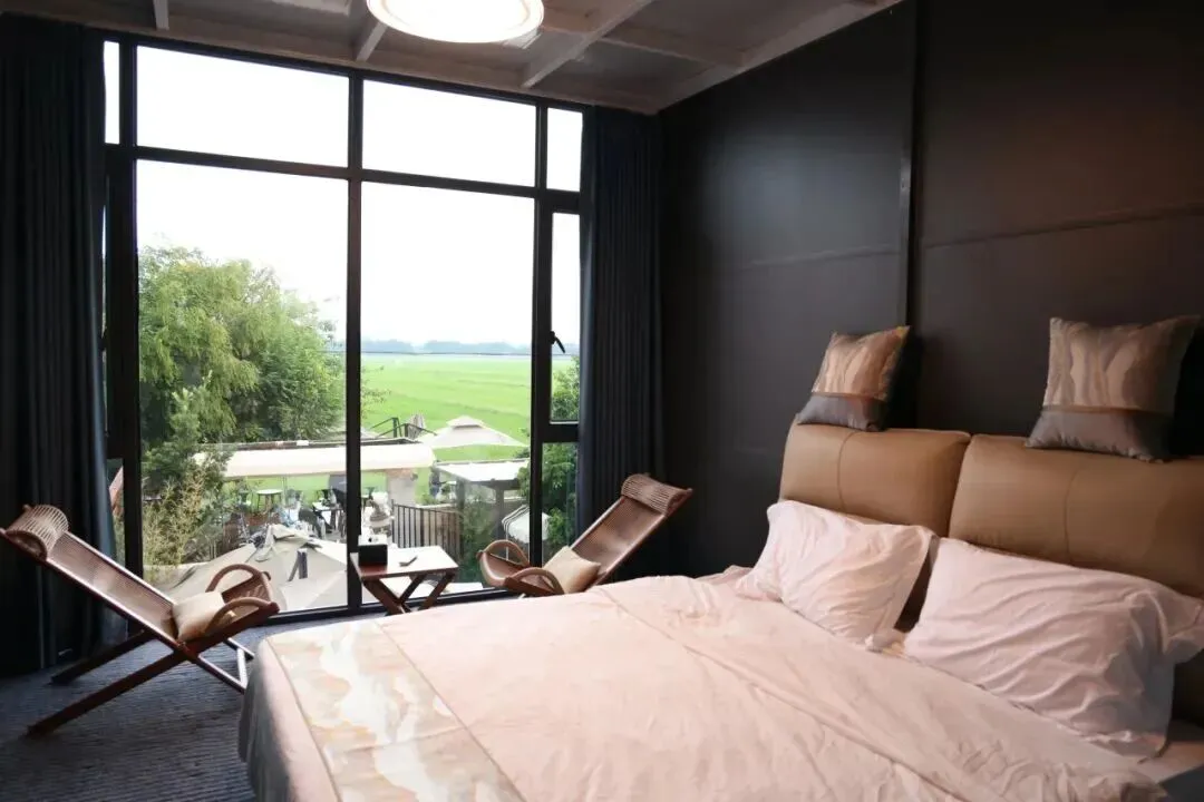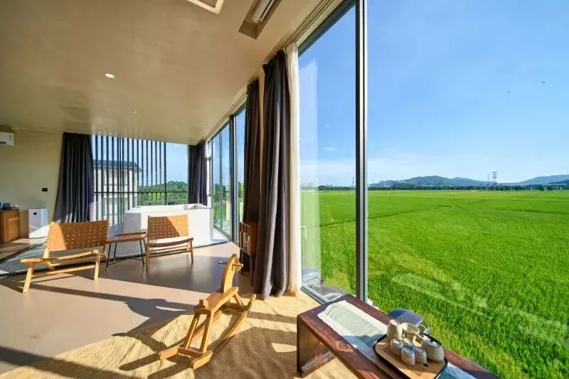 在崖口村,这间民宿融合了简餐与民宿,并以新中式风格精心打造。每间客房均配有独立观景阳台,推窗便是稻浪、日落与远山。手执一杯特调鸡尾酒,尽享悠然惬意时光。