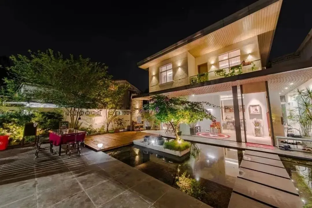 位于翠亨村的艺术民宿,由旧农舍改造而成,墙面上悬挂着画家村艺术家的作品,宛如住进一座乡野中的迷你美术馆。院内融合了庭院、水池与落地窗休闲区,巧妙地将自然乡土气息与当代艺术设计相结合。
