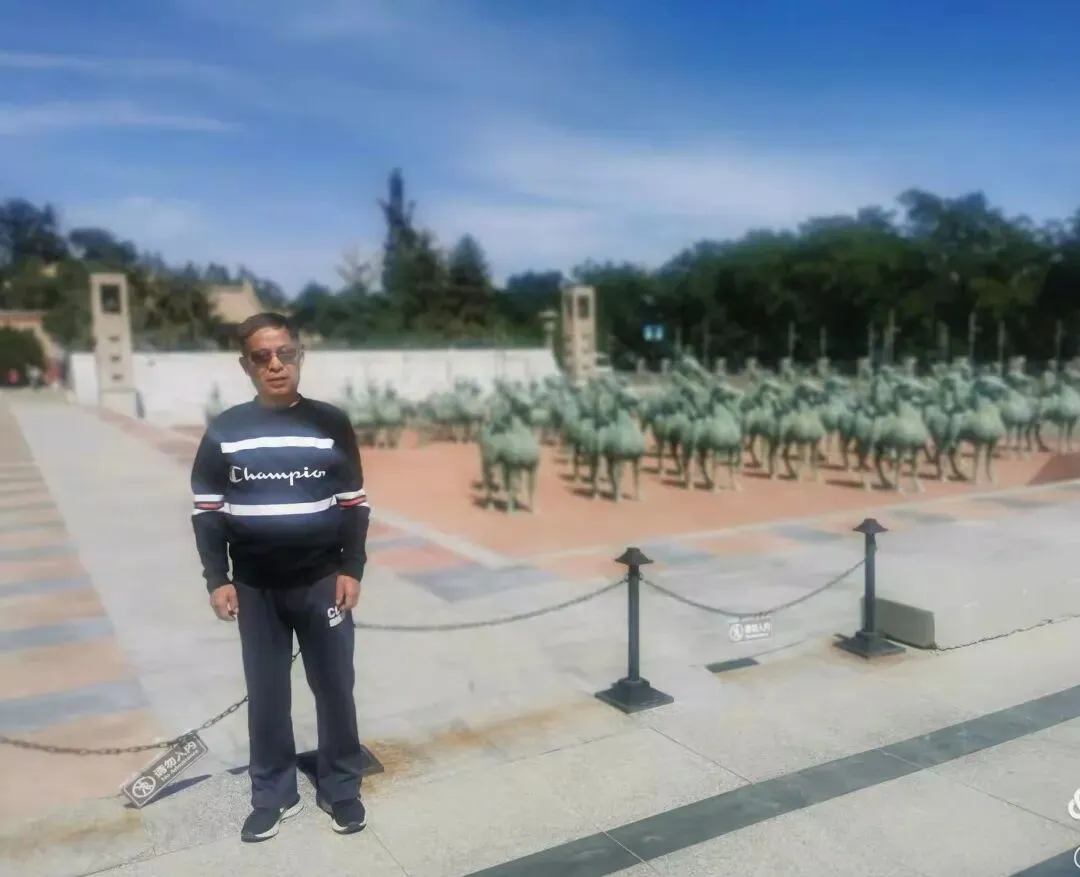 △我在武威铜车马仪仗俑阵前 雷台汉墓出土的铜车马仪仗俑包括武士俑17件,奴婢俑28件,铜车14辆(其中车1辆、招车4辆、“小车”2辆、“董车”3辆、大车3辆、牛车1辆)铜牛1件,铜马39匹,其中有铭文的8件,分别刻有冀张君骑一匹,牵马奴一人;翼张君小车马御奴一人;冀张君夫人董车马,将车奴一人,从婢一人;守张掖长张君郎君阿冉骑马一匹,牵马奴一人;守张掖长张君前夫人董车马,将车奴一人,从婢一人,守张掖长张君后夫人禁车马,将车奴一人,从婢二人;守左骑千人张掖长张君骑马一匹牵马奴一人;守左骑千人张掖长小车马,御奴一人。车、马、俑均为范模铸造,充分显示出群工精雕的艺术水平。这批庞大的铜车马仪仗俑气势恢宏,种类齐全、做工精良,是研究汉代西部政治、军事、文化的重要史料。被史学界称为“地下千年雄狮” 2002年投入资金280多万元由西安仿古工艺品有限公司将铜车马仪仗俑整体放大6倍后,安置于此供游客参观。