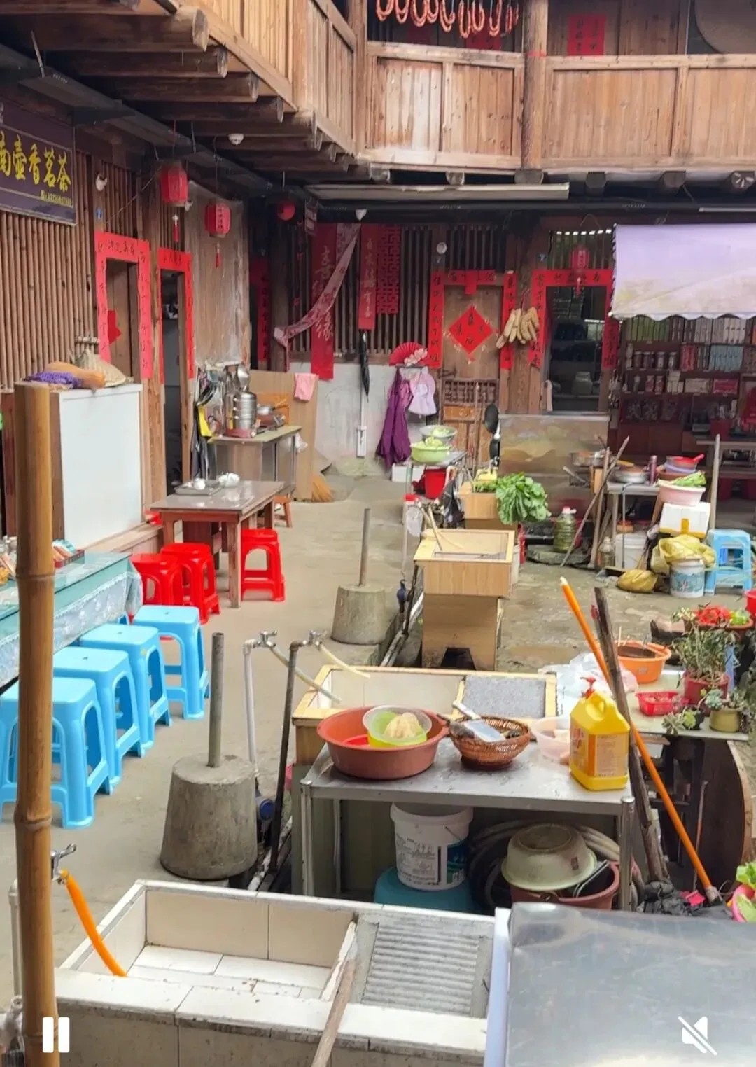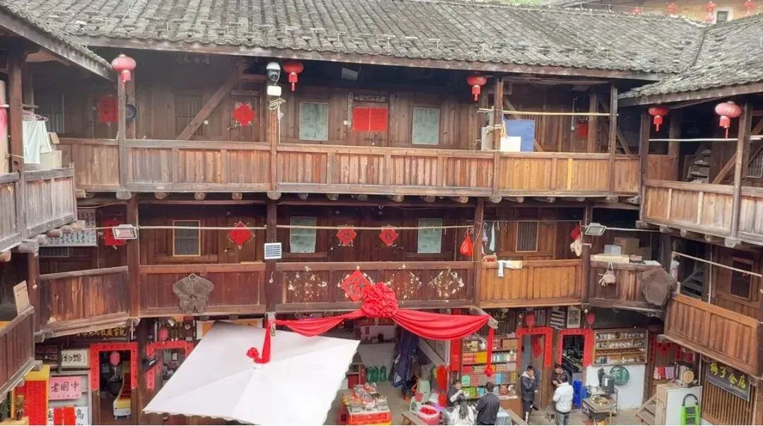 田螺坑被网红称为四菜一汤,是土楼的标志性景点。小伙还带我们去看了最大的一个土楼,裕昌楼。这是个圆形土楼,有五层,比步云楼壮观不少。院内还有个观音堂,是各家办红白喜事的地方。看着柱子上的对联,可能刚举行过婚礼。