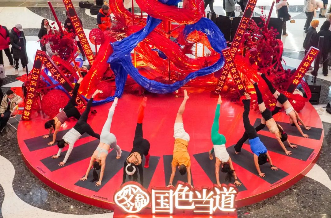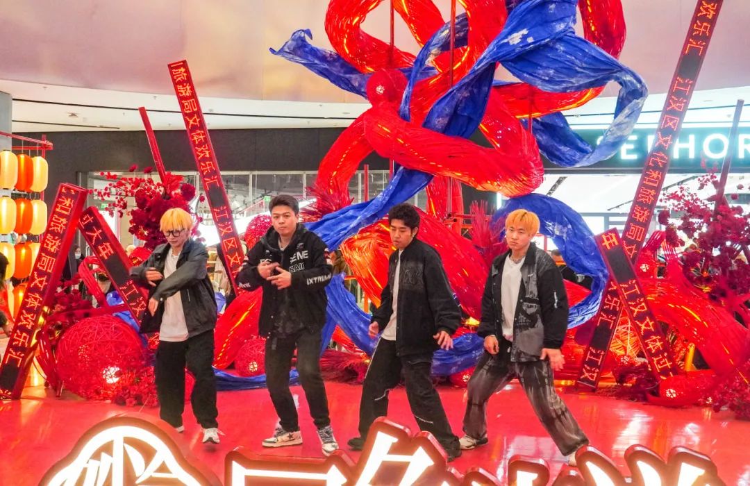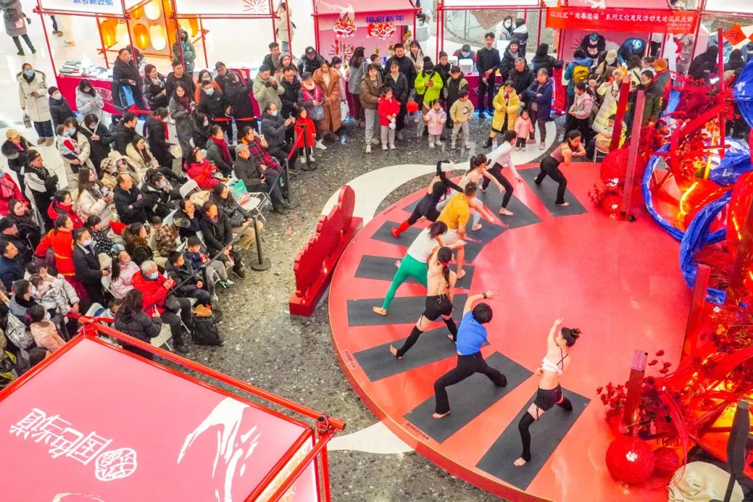 大厅内是传统与现代相融合的文艺汇演,区书法家现场送福、送春联,黄陂街小学管弦乐演奏,充满嘻哈元素的街舞,解放身体、释放情绪的瑜伽,自信、积极向上的啦啦操。