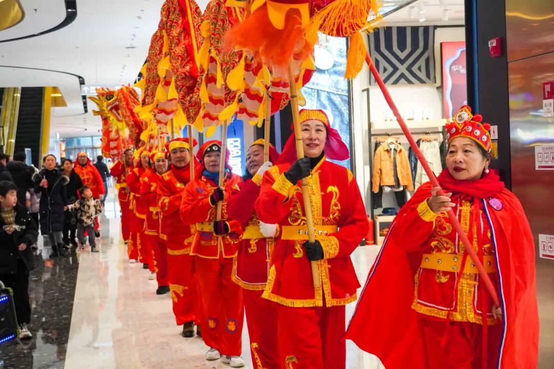 在江宸天街大门前广场,江汉区健身舞龙协会带来的《百龙齐舞迎新春》表演,随着舞龙音乐响起,金色的长龙腾空跃起,时而旋转,时而跃起,活灵活现。