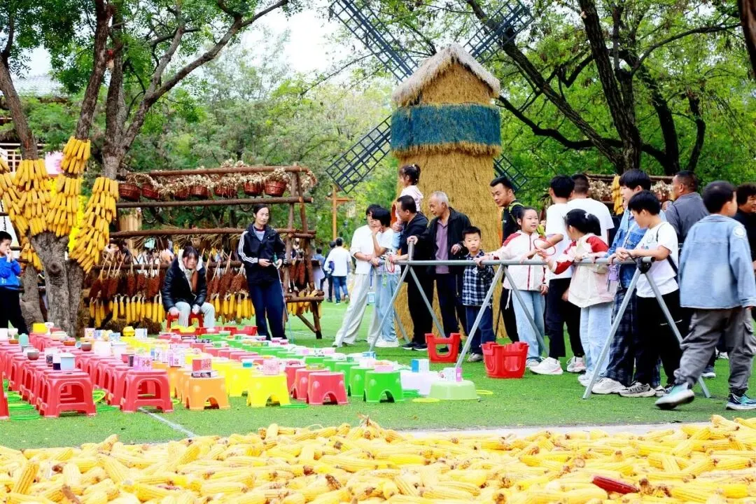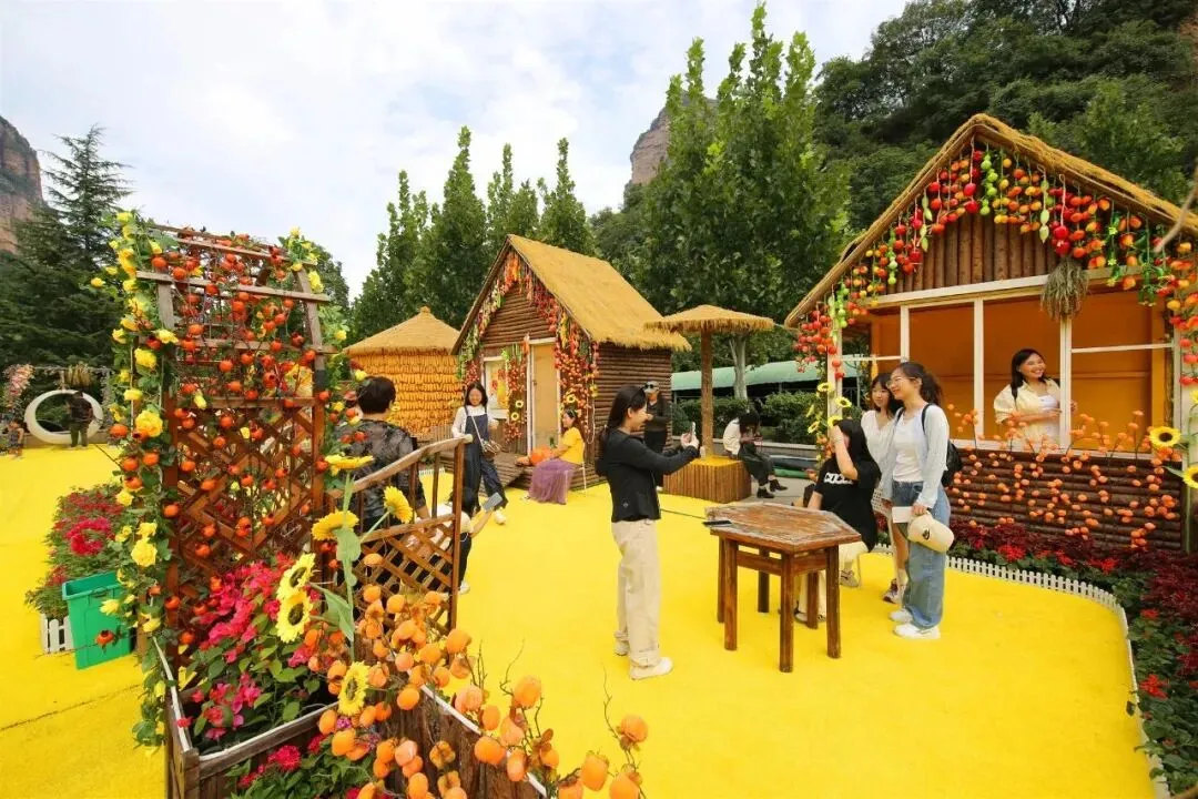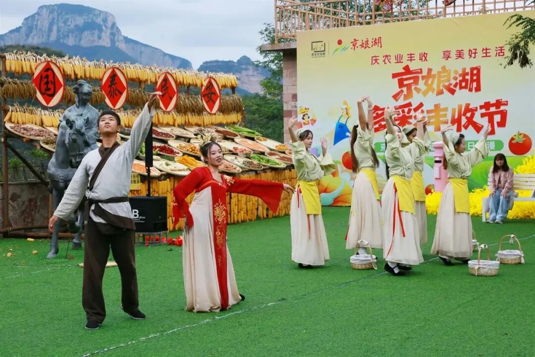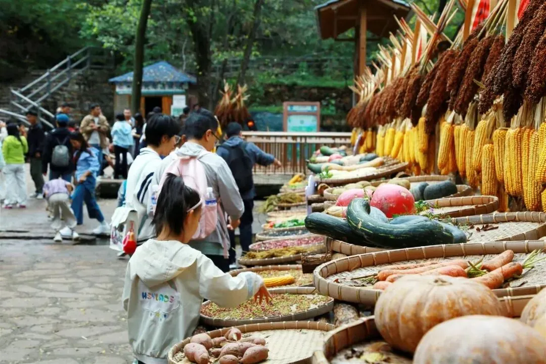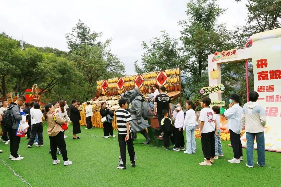 京娘湖把“丰收”搬进太行山野。山涧旁、房屋前、晒架上,金灿灿的玉米、红彤彤的辣椒、圆滚滚的南瓜,配上复古晒匾和长竹杈,宛如秋日童话。游客忙着与丰收景致合影,小朋友好奇触摸,笑声洒满山间。