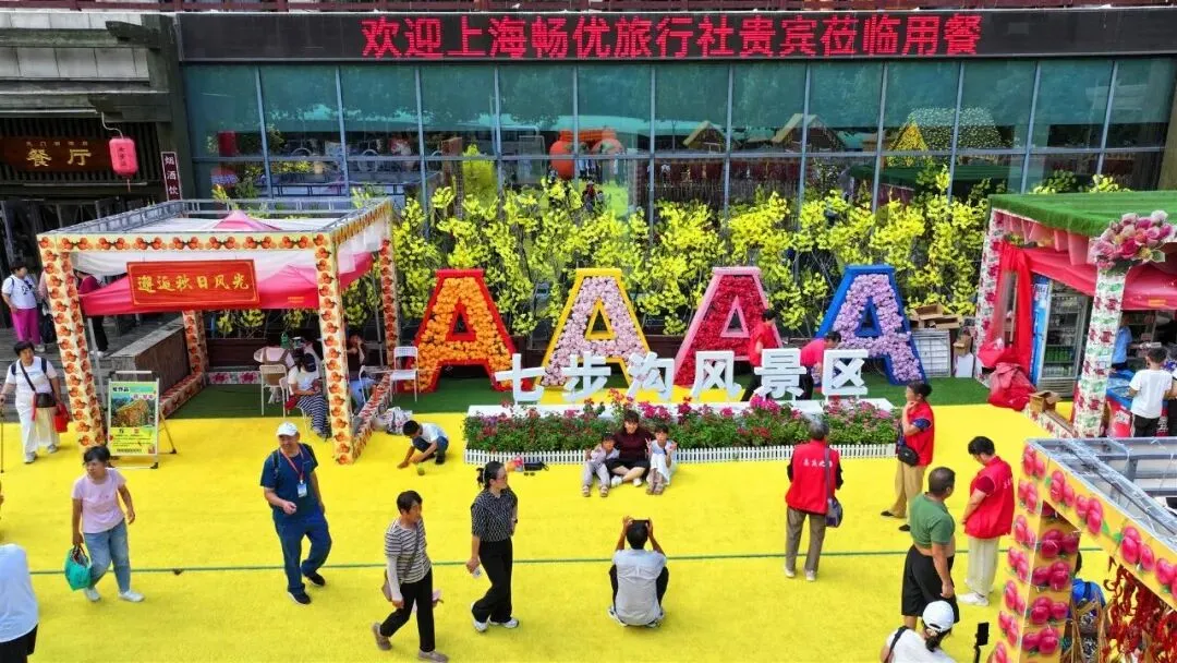 七步沟将秋日浪漫与传统文化融合。秋山草堂变身“晒秋场”,金黄玉米、火红辣椒铺满晒架,与秋景相映成趣,随手一拍都是秋日大片;花廊鲜花绽放,藤蔓缠绕,游客穿梭其中,快门声不断。