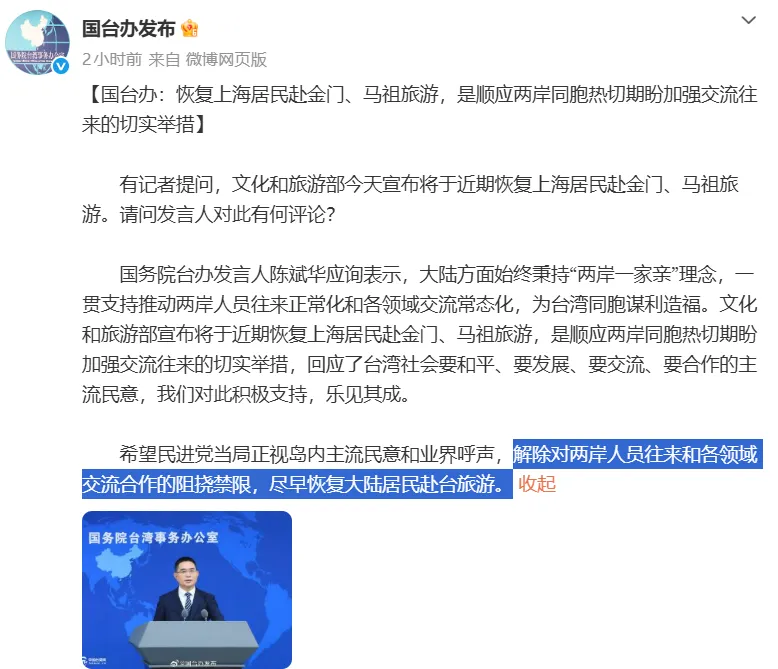 赴台旅游现希望?上海居民将可赴金门、马祖旅游!国台办回应,最后一句亮了