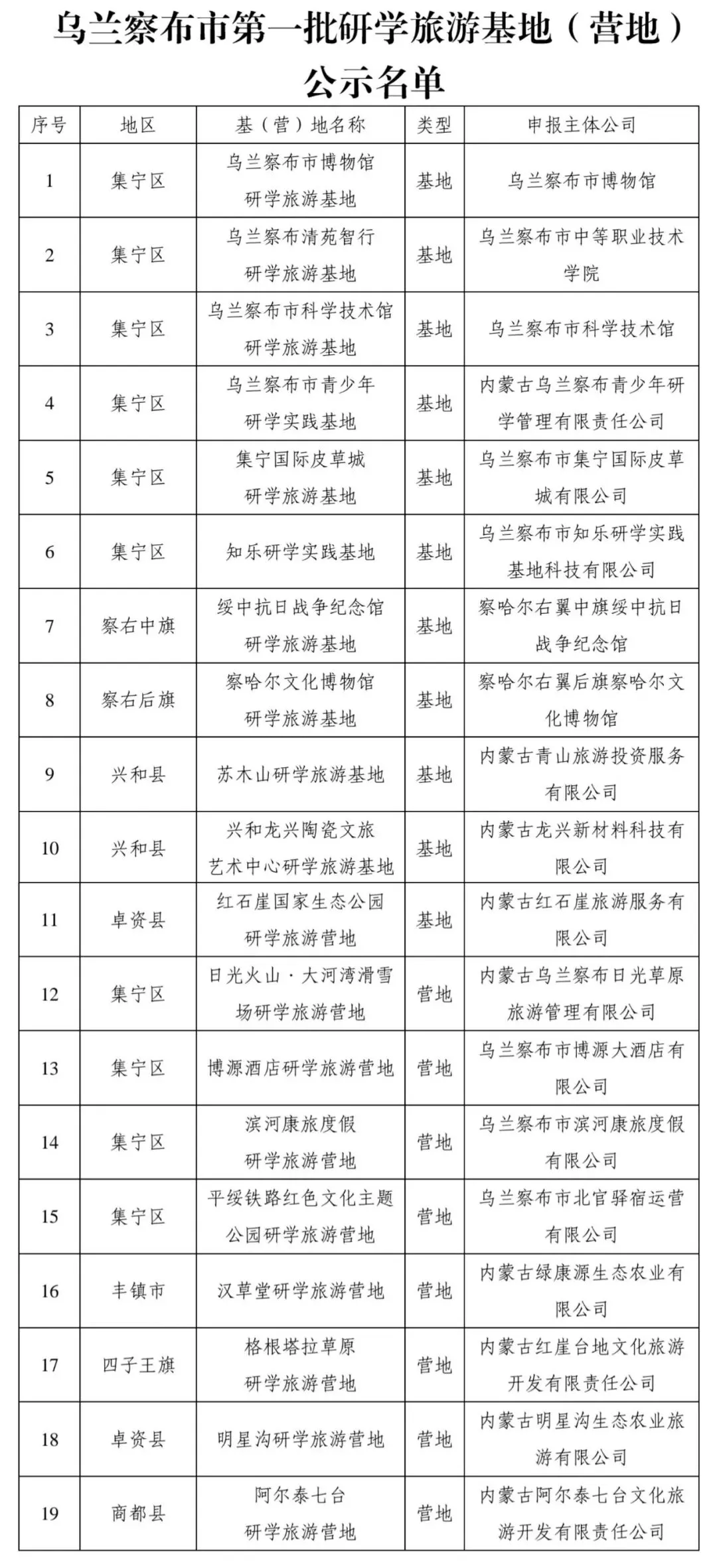 公示 | 乌兰察布市第一批研学旅游基地(营地)名单公示
