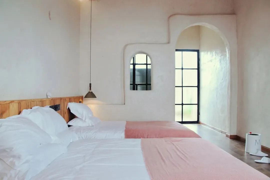 房间内的构造也与常见的民宿不同,在设计时,磨平了墙体的棱角,流畅的线条,镂空的拱形门窗,米白的色调,满满的异域风情,让客人在房间内也能拍出美美的照片。