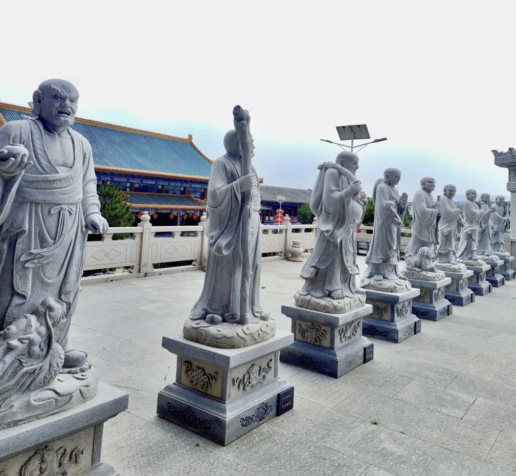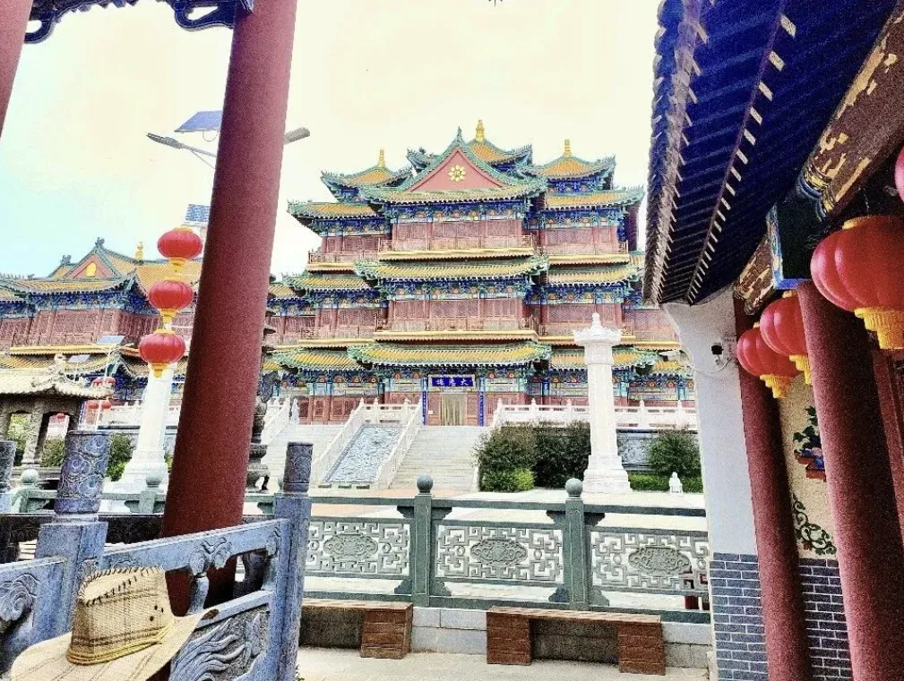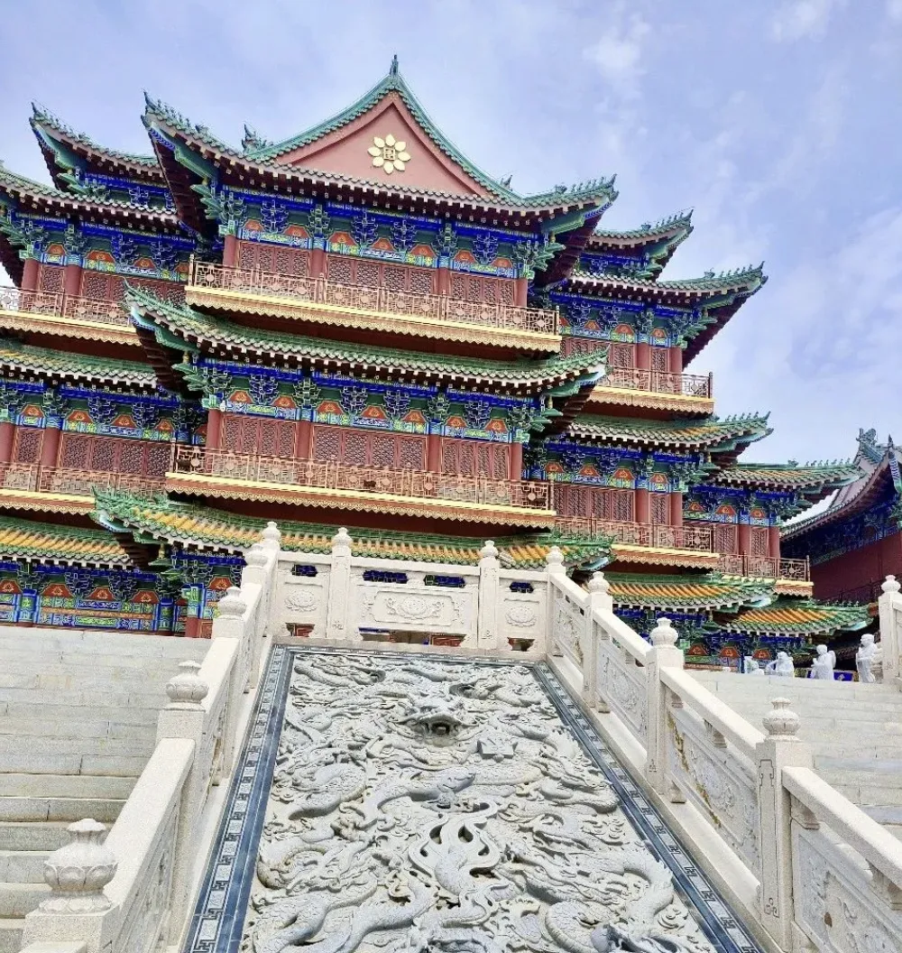 寺院占地近百亩,依“一个中心、三大轴线”布局,五进庙宇沿中轴线对称排布,既显佛教寺院的庄严规整,又融合地母文化与红山文化精髓。中路为朝圣礼佛轴,山门内的天王殿供奉四大天王,守护佛法;核心建筑大雄宝殿是僧众法事活动的主要场所,供奉释迦牟尼佛;全寺最高的圆通宝殿高29米,三层楼阁式结构覆以黄琉璃瓦,殿内16.88米高的十一面千手千眼观世音菩萨造像,纯铜铸造并贴金,工艺精湛,为目前已知同类造像中最高者之一。