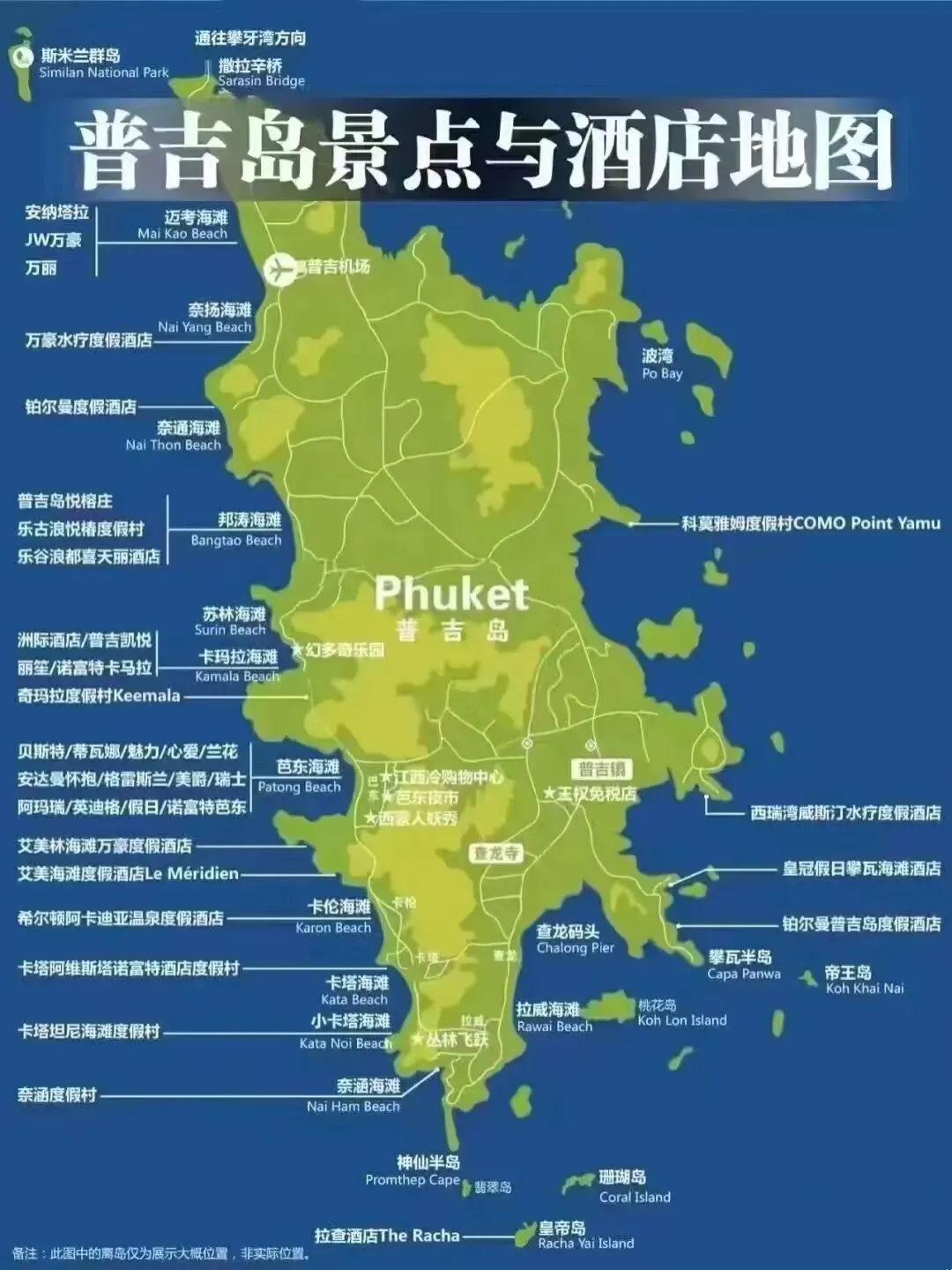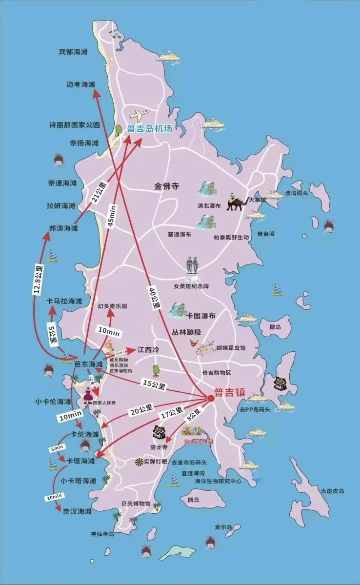 *图片来源于网络,著名的飞机沙滩。 由于海岸长,站在沙滩上视野宽阔,天气好时,可完整看到瑰丽的日落景致,并且因为距机场近,有时飞机起降也成为晚霞画面的最佳点缀,也因此这里成为普吉最佳赏落日地点之一。 *我去年也去了这里,恰逢泰王来普吉(在此乘飞机起落),海滩军队被封锁了,没有拍出照片。 耐通海滩在在机场南边,离机场也很近,这里目前基本上没怎么开发,所以很适合一个人安静得坐着晒晒太阳。 这是也是当地渔民用的小海滩,在这里能看到普吉岛没开发前的景象。每年五月到十月的雨季时候,这里的风会比较大,浪会比较高,这个时间建议这里就不要去了,比较危险。 邦涛海滩坐落于普吉岛西海岸的中间地区,是岛上首屈一指的高级休闲度假区(拉古娜和悦榕庄等豪华度假村都在这里)。有时候也叫拉古那海滩,因为这个海滩的大多数地方都是拉古那度假村的区域。因为是度假村区域,所以相对来说,游客比较少,海滩十分安静。 苏林海滩位于卡马拉北侧,是一个很小的一个海滩, 但海滩的环境很好,有很多的泰式餐馆,附近还有很不错的酒店。中国人来这里不多,西方游客比较喜欢这里。 这里安静却又活力,人少所以商业设施也不多,造成的污染很少,水质相对来说不错。很多杂志会说这个海滩才是普吉本岛最美的海滩。 卡马拉海滩曾经是一个安静的小渔村,与其他海滩不同的是,卡马拉海滩仍属于相对未开发状态,现今依旧是普吉岛上唯一一个保持原始渔村旧貌的海滩,虽然普吉岛已经是国际知名的度假胜地,但卡马拉海滩上的渔民依旧在撒网捕鱼,过着旧日的平静生活,卡马拉海滩也以其原生态的朴实环境吸引了众多游客光顾。 也叫奈涵海滩,这里要注意,这个海滩不是奈涵酒店私家沙滩。作为小众沙滩只有周边酒店住客和自驾游游客到访。 奈汉海滩是普吉岛西海岸最南端的“弓形”海滩,是由南北两端高山环绕的深水湾。站在海滩两侧的山上,就能将美丽的海滩美景一览无遗,尤其是从这里看到的安达曼海日落,是泰国最美的夕阳景色之一。奈汉海滩与神仙半岛离得非常近,都在普吉岛南端,神仙半岛看日落的人很多,如果想清静又欣赏到日落,来奈汉海滩的山上看,也是一个很好的选择。 这里水深浪平,很适合开展游艇活动,所以泰王杯船赛就在这里举行,奈汉海滩也是普吉游艇俱乐部的基地。 拉威海滩位于普吉岛的南部海岸,这里的沙滩沙质细软洁白,海浪层叠,且有不少渔民聚居在此。这个海滩有个海鲜市场,都是卖最新鲜的食物,不过价格也并不是特别便宜,一定要记得砍价。 海滩周围的岸上生长着许多枝繁叶茂的参天大树,当地的泰国人经常会来此聚会,买上一些碳烤海鲜和青木瓜沙拉,然后坐在沙滩草席上一边聊天一边野餐,颇为惬意。但是因为这里来往的船只比较多,所以并不是很安静。 如果你不想出海的话,可以选择来这里,这是普吉岛唯一收费的近岛海滩,费用大概是200泰铢。这里一年四季可以游泳,而且安全有保障。海滩面积不大,长度只有150米,位置在芭东海滩附近,芭东湾对面的景色尤为迷人。旁边还有一个小海滩,二者通过一条石径相通。 天堂海滩种满了棕榈树和热带片片荫凉。沙滩两头是巨大的花岗岩,100米开外有一个珊瑚礁。所以这里也是一个浮潜的地方,不需要出海,就可以在普吉本岛浮潜。 最后总结来说,如果喜欢热闹的话,三大海滩还是首选,迈考海滩是亲子的另外一个选择,而班涛海滩(拉古娜)也是酒店度假区,如果有喜欢的酒店的话,也是一个不错的选择。如果喜欢安静的话,其他的小众海滩也是各有特色。 3.出海海岛介绍: