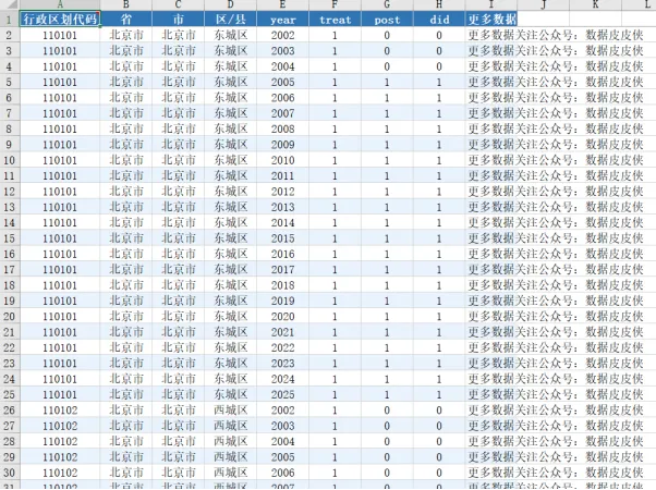 行政区划代码 | 省 | 市 | 区/县 | year | treat | post | did |