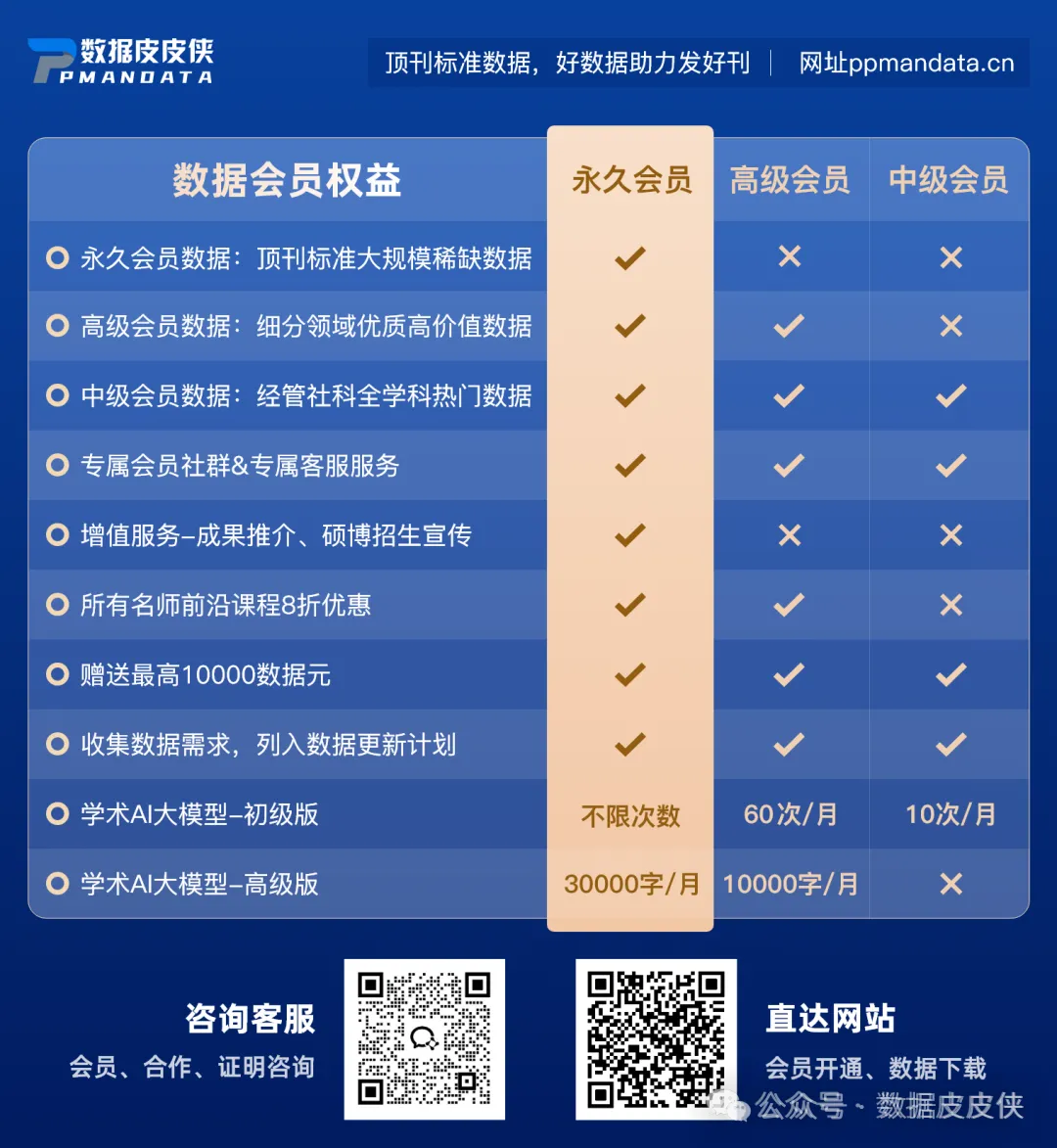 CNPaperData(简称CNPD)是立足大规模数据采集、清洗、挖掘的国家高新技术企业,借鉴Compustat、WRDS等国际知名数据库及FT50期刊专业标准,打造中国特色经济管理社会科学研究型数据库。涵盖上市公司、企业、省份、地级市、县域、高校、人物等研究对象,涵盖经济、法律、金融、政策、科技、文化、健康、环保、人口等各类热门数据。顶刊标准数据,好数据助力发好刊!获取数据地址ppmandata.cn/trade/list
