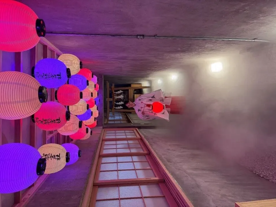 穿过灯笼悬垂的长廊,薄雾如云般氤氲,光影交错之间营造出梦幻又神秘的通道,仿佛引领访客走入另一段时空。