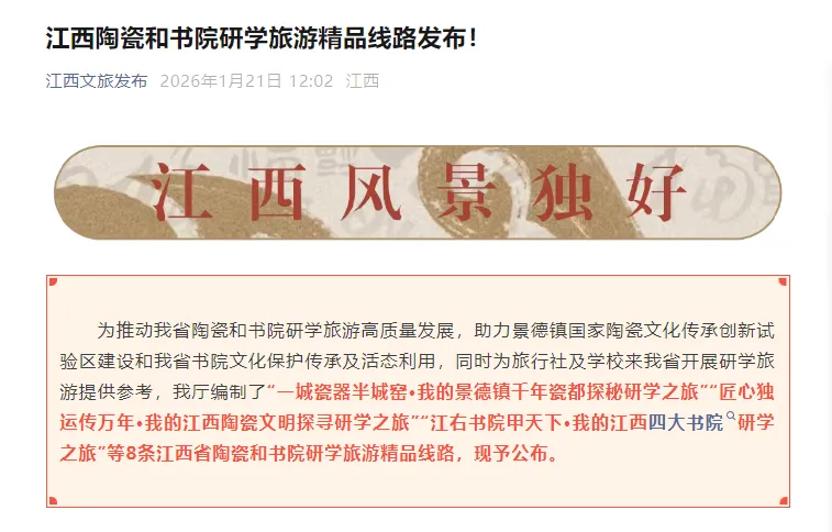 近日,江西省文化和旅游厅正式发布8条研学旅游精品线路,涵盖陶瓷与书院两大主题,旨在推动全省陶瓷与书院研学旅游高质量发展,促进传统文化保护、传承与活化利用。