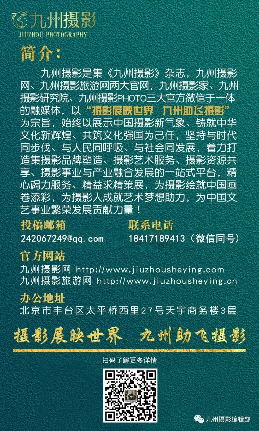 3、参选者有机会获得在九州摄影旗下九州摄影网、九州摄影旅游网站,“九州摄影家、九州摄影研究院、九州摄影PHOTO”三大官方微信公众号 ,视频号、抖音号等媒体宣传推广,九州摄影并与央视、北京电视台及腾讯、今日头条、优酷等新媒体开展合作,进行全方位立体化报道展示;