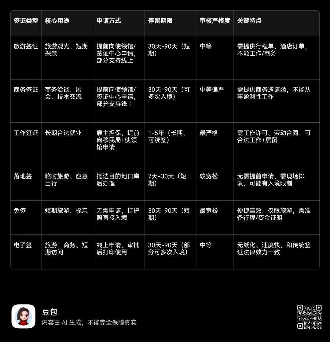 六种签证类型大揭秘:一张图看懂商务、旅游、工作、落地、免签、电子签的核心区别