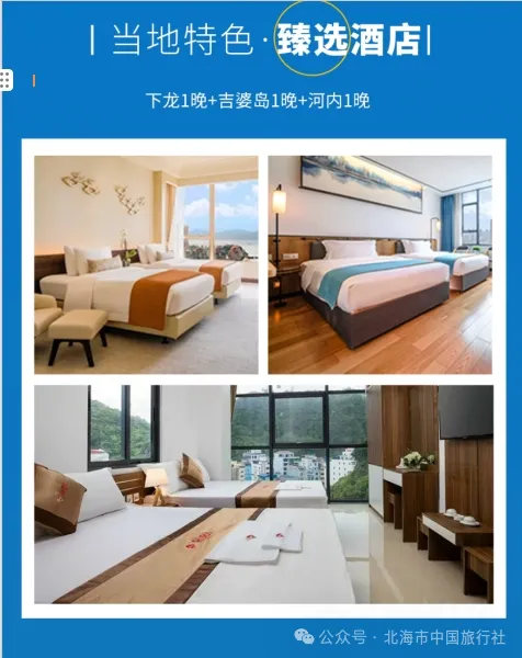 早餐后前往太阳港码头,随后乘坐游轮畅游海上桂林—下龙湾。倘佯于万顷碧波之中;漫游被国际教科文组织评为世界自然遗产之一的“海上桂林”—下龙湾,在 1500多平方公里的海面上、耸立着 3600 多座大小不一、千姿百态的喀斯特地貌的山石、更以其“海美、山幽、洞奇”三绝而享誉天下。越南的下龙湾,以美丽的海上风光而闻名于世。下龙湾奇形怪状的岛屿很多。但它的最典型标志,就是斗鸡石。所谓“斗鸡石”,就是两座邻近的小岛,造型奇特,形状犹如两只面对面的斗鸡。它俩怒目相视,嘴角相向,好像随时准备腾跃而起,展开一场惨烈的决斗;11:30-12:30 在游轮餐厅享用自助餐和蔬菜水果的,下龙湾的特色海鲜。一边聆听抒情的音乐,边观赏下龙湾的美景,享用高级菜肴,各类美食,满足味蕾;客人可根据自身情况选择乘坐小木船或浆板进到【月亮湖】中心游览,费用可根据游轮上的价格表参考;(月亮湖是一个360度皆为垂直绝壁的封闭海湾,空气幽闭、湖水清澈见底、水平如镜,从上面俯瞻圆如满月),这里还有西方国家特爱的桨板活动(小木船或浆板体验费用自理);前往【惊讶洞】惊讶洞的特色是它很象天上宫殿的辉煌美丽。这里有经数百万年造化形成的,多彩多样的巨型石乳,特别还有龙王形象及其极富人文性传说的文化蕴味;后前往越南最浪漫、最漂亮的岛屿【天堂岛】,天堂岛是下龙湾唯一有沙滩的岛屿,金黄色的沙滩,蔚蓝色的海水,仿佛置身世外桃源一般,登上天堂岛,领略“会当凌绝顶,一览众山小”的感觉,环顾四周,如同进入蓬莱仙境;下午安排【下午茶宴】,回到船上享用茶点,随着季节的变化,安排松饼、三明治、茶、咖啡等,享受这慵懒散漫的下午时光。后缓缓向下龙湾码头驶去。下船后参观越南国家沉香博物馆;前往吉婆岛乘渡轮前往吉婆岛后乘车前往酒店。后乘坐电瓶观光车或其它交通工具游览吉婆岛美丽的一号沙滩,后可自行逛吉婆岛夜市,酒吧街,也可以与欧美背包客一起点上一瓶啤酒,感受吉婆岛的慢节奏,后自行返回酒店休息。