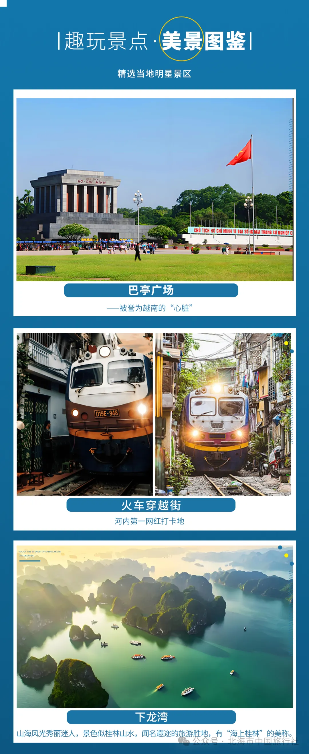 随后游览参观越南的心脏----巴亭广场(约1小时);外观胡志明陵、主席府、军事博物馆、由一根石柱撑起的独柱寺,车游西湖(越南西湖(有的史书上又称金牛湖),是河内的著名胜景,为河内第一大湖,素有“河内第一风景区”之称),游镇国古寺(约40分钟)(镇国寺是河内最古老的寺庙之一,独特的建筑、巨大的文化和历史价值,1989年镇国寺被列为越南国家级“历史文化遗产”)。车游最为耀眼的中国驻越南大使馆,如自费体验人力三轮车0.5小时可以游还剑湖、三十六条古街、河内最古老的教堂-亚瑟约夫教堂外景、河内歌剧院外景;后乘车前往河内第一网红打卡地-火车穿越街游览(15-20分钟)。
