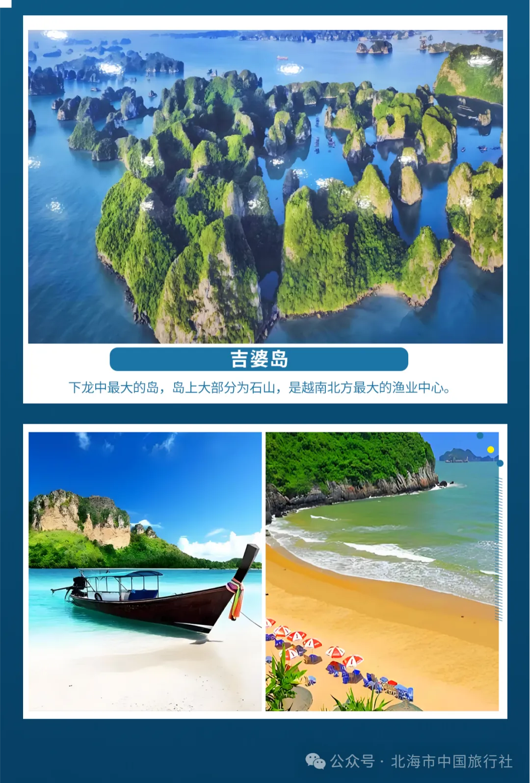 吉婆岛是下龙湾中最大的岛,岛上大部分为石山,是越南北方最大的渔业中心。吉婆岛有非常著名的【白沙海滩】(Cat CoBeaches)分别被命名为吉婆岛1号海滩、吉婆岛2号海滩和吉婆岛3号海滩,其中吉婆岛2号海滩最清静也最吸引人。