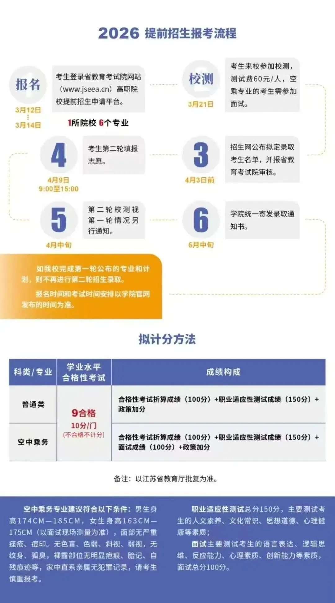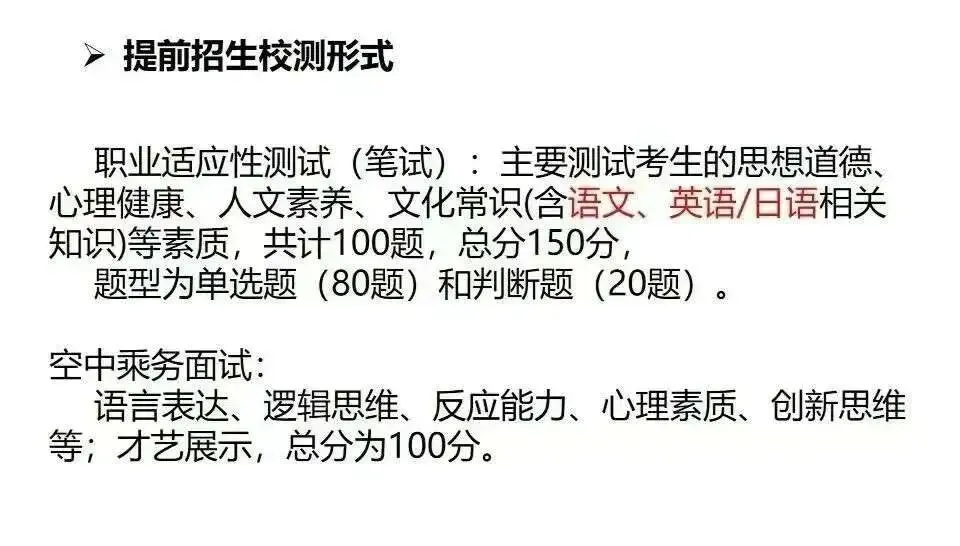2.空中乘务类考生采用“合格考折算分100+职业适应性测试150+面试成绩100+政策性加分”从高到低录取。