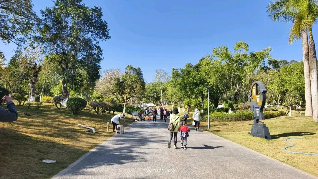 到了公园,停车很方便,公园建设得很好,草坪整齐,有很多热带的树木,阳光灿烂,绿意盎然的。