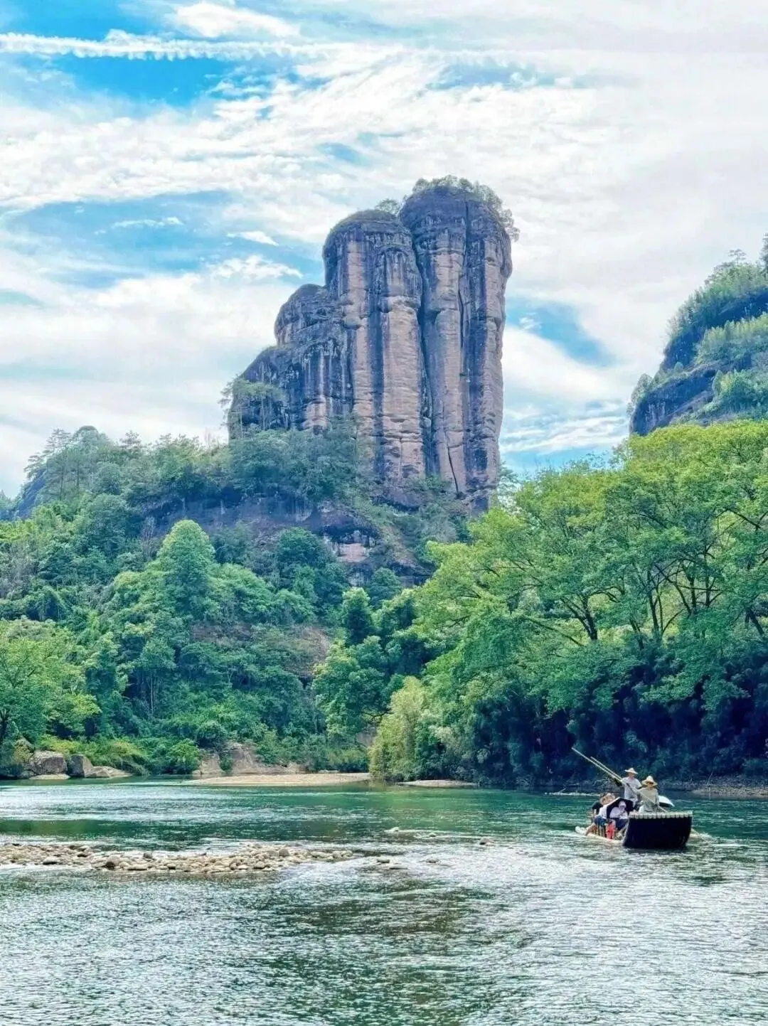 坐竹筏漂过,艄公的筏子点在水底的鹅.卵石上,声音清亮.。爬到天.游峰顶,云雾漫过.来,整片丹山.碧水都成.了水墨画的一角。.下.山.的路边,随便.一家小店的.红.袍,.都带着岩骨.花香。