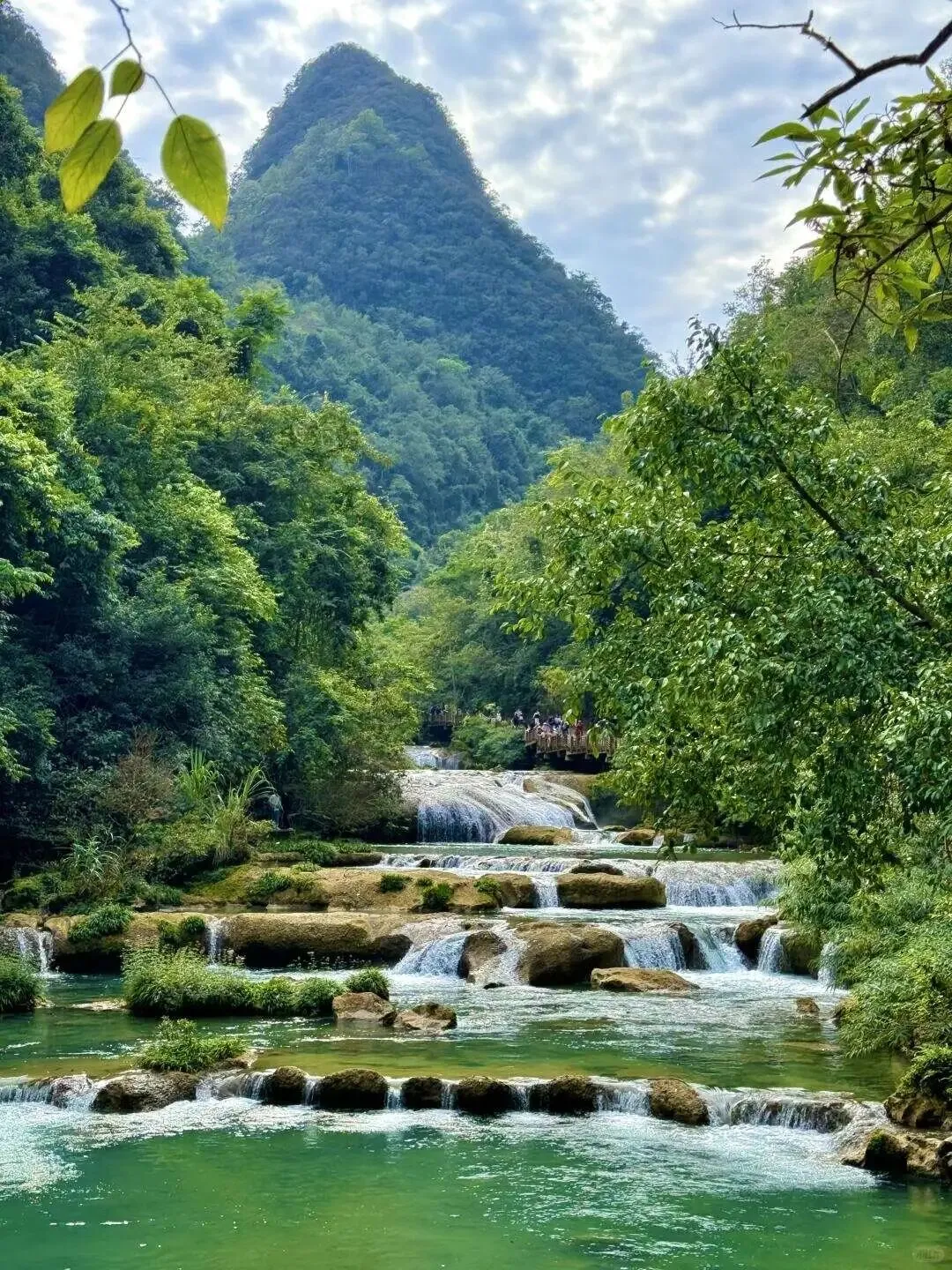 看一潭水,绿.得像块.没切开的翡翠。小七孔古桥下的水,.清得让人.想喝一口。走水上森林,.石.墩子铺.在.水里,你得踩着过去,鞋底刚好沾湿。响.水河的瀑.布.不高,.但宽,水声轰轰的,带着水汽.扑在脸上,比空调风舒服。