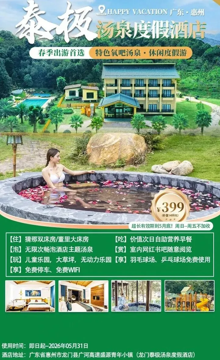酒店地址:广东省惠州市龙门县广河高速盛源青年小镇(龙门泰极汤泉度假酒店)
