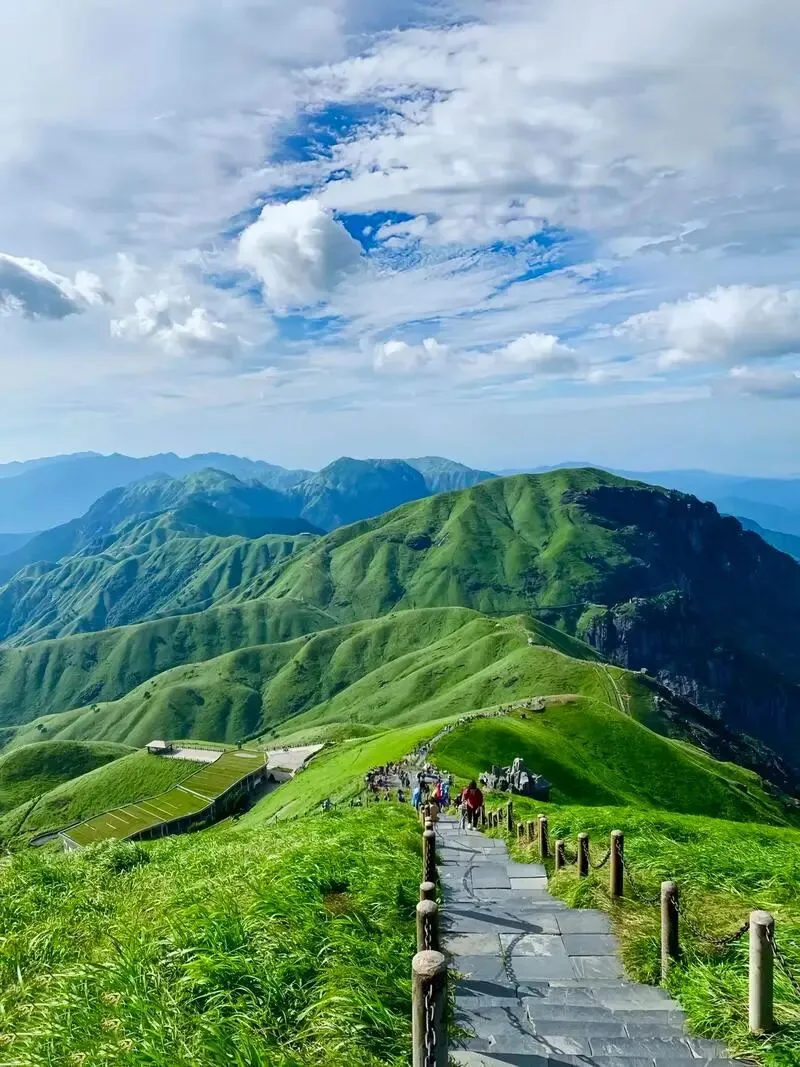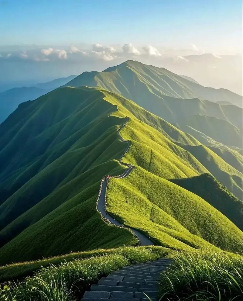 名字就叫武功山,主峰金顶海拔一千九百多,风一吹,草像海,云也跟着翻。