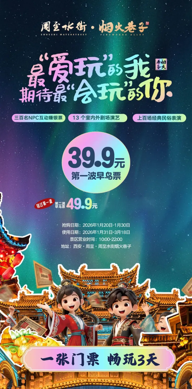 【西安·周至水街·烟火巷子景区丨1月31日盛大开园!周末、寒假、春节通用!第一波早鸟预售票】39.9元连续畅玩3天?