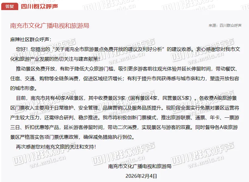 近日,有网友在四川群众呼声留言,建议南充全市旅游景点全面免费开放。2月4日,南充市文化广播电视和旅游局就相关问题作出回应。