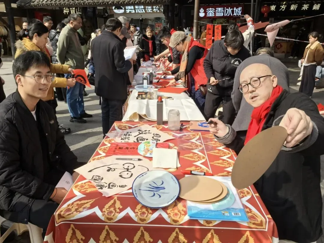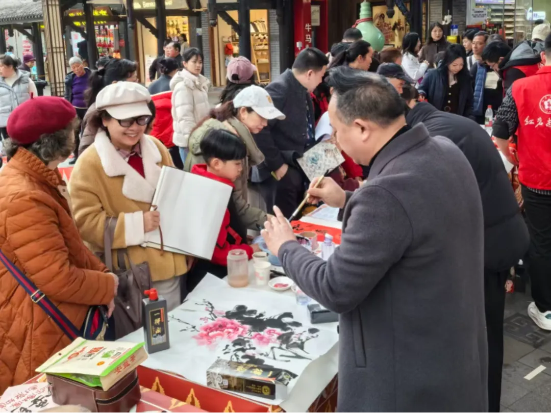 活动现场,人气高涨,暖流涌动,闻讯赶来的游客、周边社区居民络绎不绝。受邀前来的侨界书画家们挥毫泼墨,笔走龙蛇,一副副充满吉祥寓意的春联、一个个苍劲有力的“福”字跃然纸上,寄托着对新年美好生活的期盼。其中,侨界漫画家还现场为游客和居民即兴写生,寥寥数笔间生动传神的肖像便跃然纸上,引得众人驻足围观、笑语连连。大家纷纷排队领取这份特别的“文化年货”,欢声笑语与浓郁墨香交织,构成了古镇一道独特的风景线。活动期间,书画家和志愿者们还走进临街商铺,将一幅幅手写春联和“福”字送到商户手中,让传统文化的温暖浸润到景区每个角落。